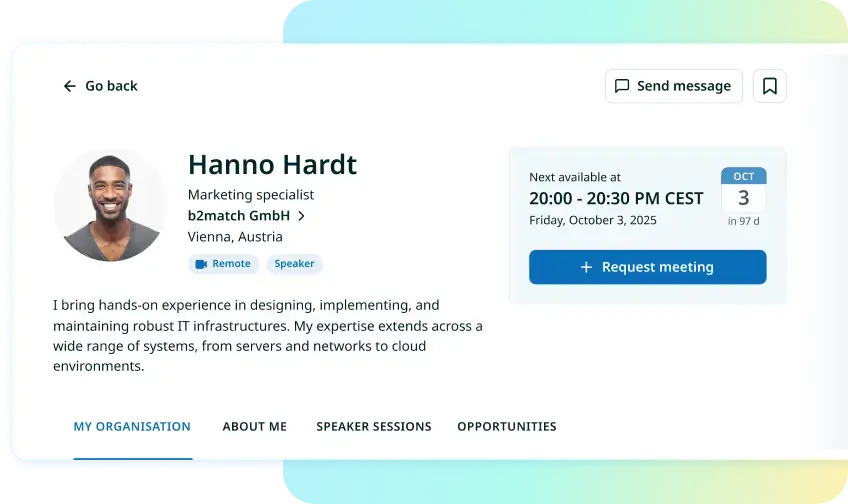 Statten Sie Ihre Teilnehmer mit einer leistungsstarken B2B-Networking-Software aus, die sie mit den richtigen Gesprächspartnern zusammenbringt.