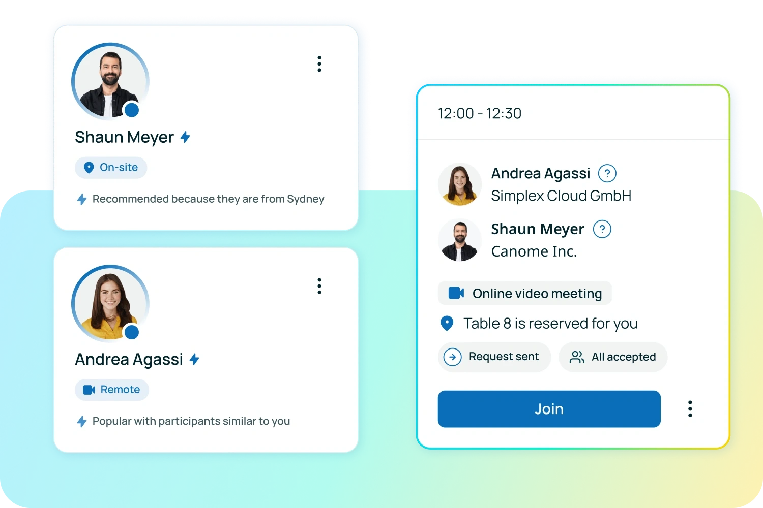 Unsere KI schlägt automatisch die besten Gesprächspartner vor und vereinfacht die Terminplanung – für reibungsloses Networking.