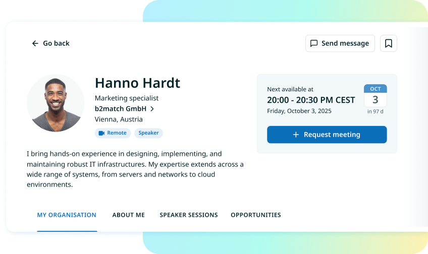 Effizientes Networking entsteht nicht durch Zufall, sondern durch Technologie, die Menschen gezielt zusammenbringt. Mit dem intelligenten Matchmaking von b2match finden Teilnehmer automatisch die richtigen Gesprächspartner. Geben Sie Ihren Teilnehmern eine leistungsstarke B2B Networking Software an die Hand.