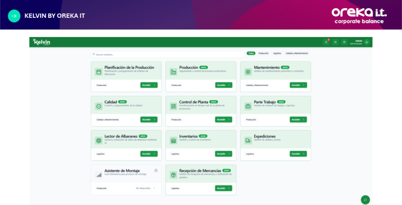 La implementación de un software MES (Manufacturing Execution System) es fundamental para tener un control total sobre el proceso productivo de tu empresa. Con nuestra solución KELVIN by Oreka IT, podrás optimizar procesos, aumentar la productividad y tomar decisiones estratégicas basadas en datos precisos e interconectados, reduciendo tiempos de inactividad y asegurando una producción eficiente.