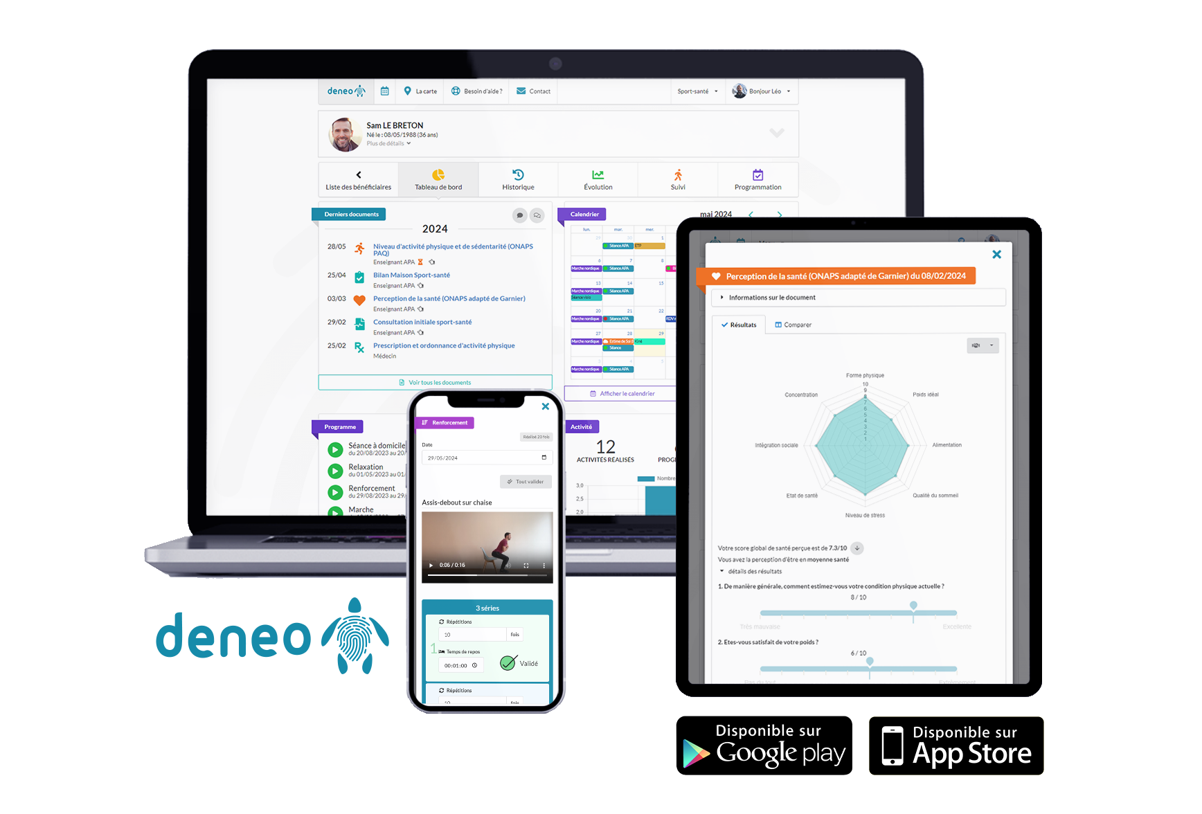 Deneo est une solution innovante dédiée aux parcours de réadaptation et sport-santé, conçue pour simplifier et redonner du sens au suivi des patients. Grâce à notre plateforme, les professionnels peuvent évaluer et suivre leurs patients de manière plus efficace, tout en gagnant du temps précieux. Deneo facilite également la coordination entre les équipes pluridisciplinaires, assurant une collaboration harmonieuse. En offrant un espace personnalisé et une application dédiée, nous renforçons l'engagement des patients dans leur parcours de soins. Avec Deneo, l'accompagnement devient plus humain et cohérent.