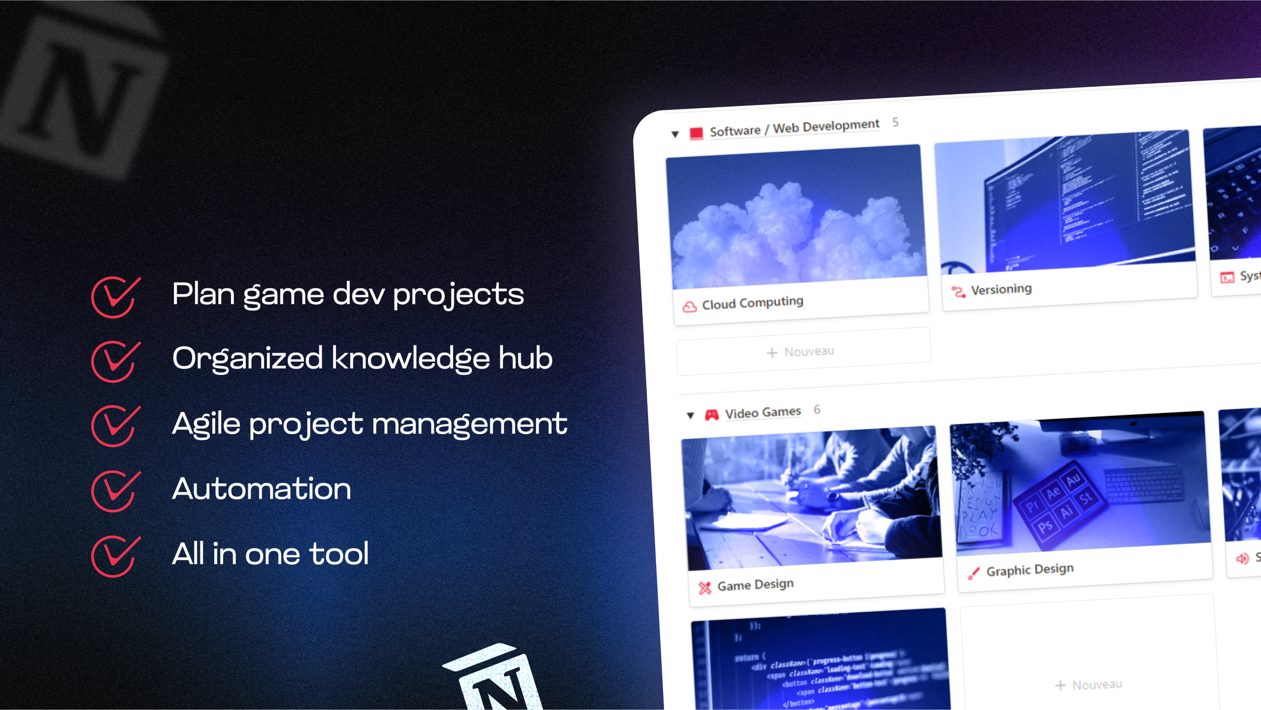 Ce qui distingue ce template, c'est la documentation complète et spécifique à l'industrie qu'il contient, tirée directement d'années d'expérience dans la gestion d'un studio de jeu. Des guides sur la gestion de projet au playtesting, en passant par le suivi financier, le GDD et même les processus détaillés de création de VFX dans Unreal Engine, cette mine de ressources vous épargne d'innombrables heures de documentation et de création de votre propre espace Notion.