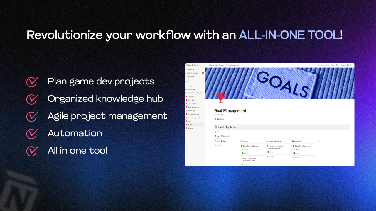 Que vous soyez un développeur solo ou que vous travailliez avec une équipe, ce template va booster votre productivité. Sa structure modulaire et flexible vous permet de l'adapter à vos workflow uniques, tandis que les modèles de documents, les tutoriels et les vues préconçus vous permettent de démarrer sans perdre de temps.