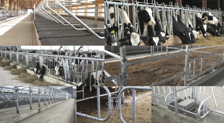 Diary farm: fasteners and dividers for loose housing of cattle, adjustable beam, diagonal grates, headlocks, gates, fences for cattle chutes.