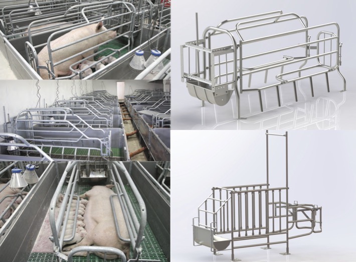 Pigs farm: farrowing machines, sow insemination and individual housing stall, equipment for group housing of pigs, bunker type feeders for pigs, watering and feeding system.
