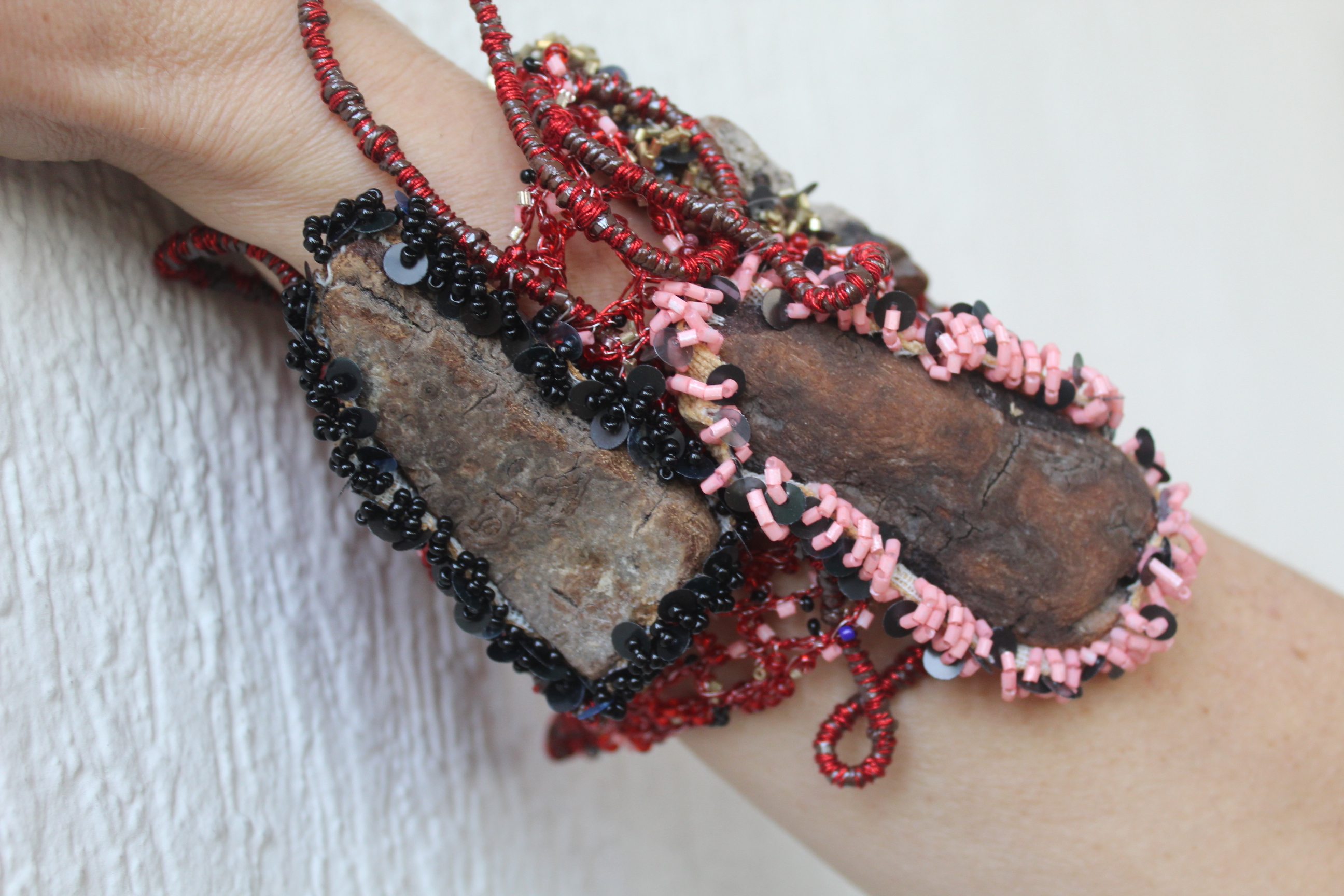Filo metallico, perline di vetro, paillettes di lastre radiologiche, filati in cotone, nastro audiocassetta, legni spiaggiati, tessuto.