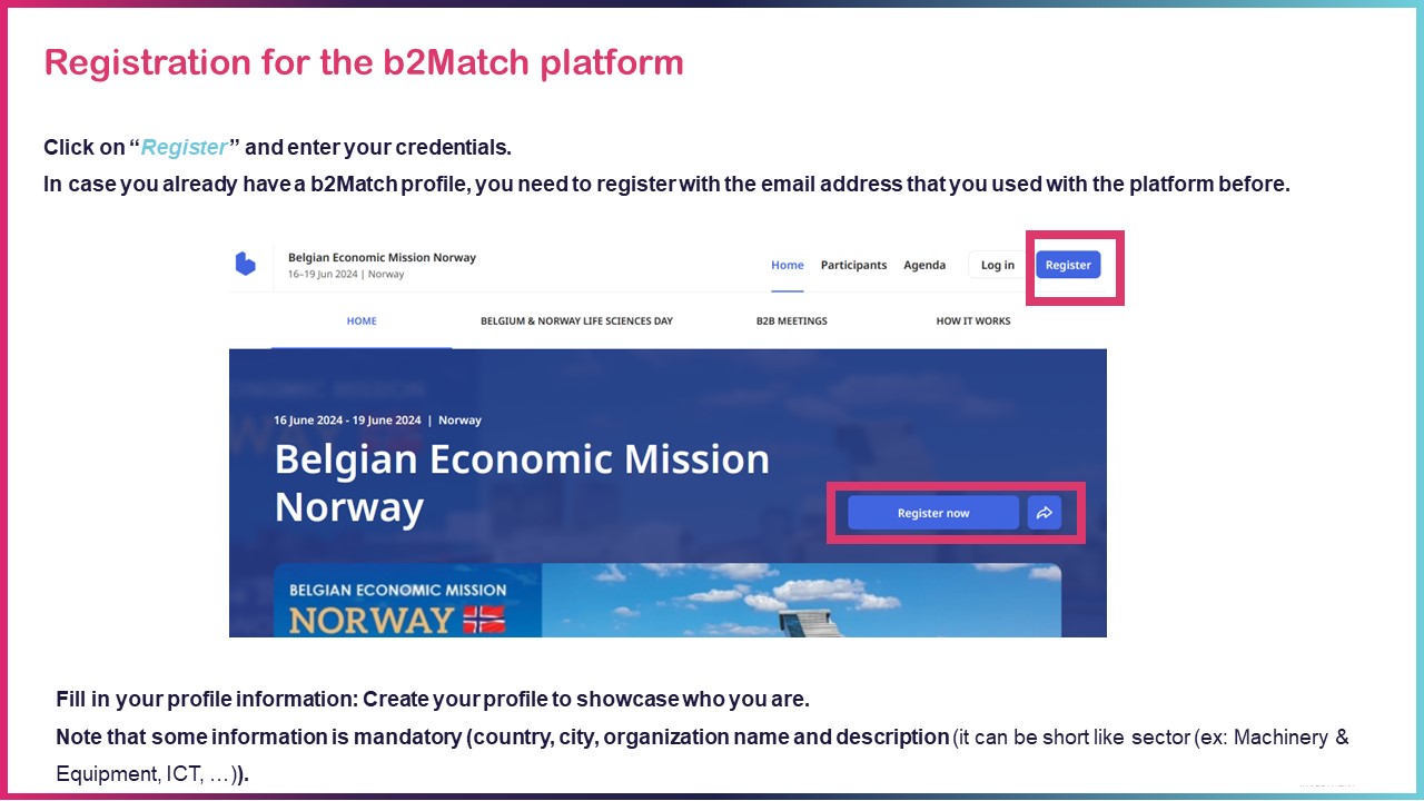 First step: register on the B2match platform (frame 1)