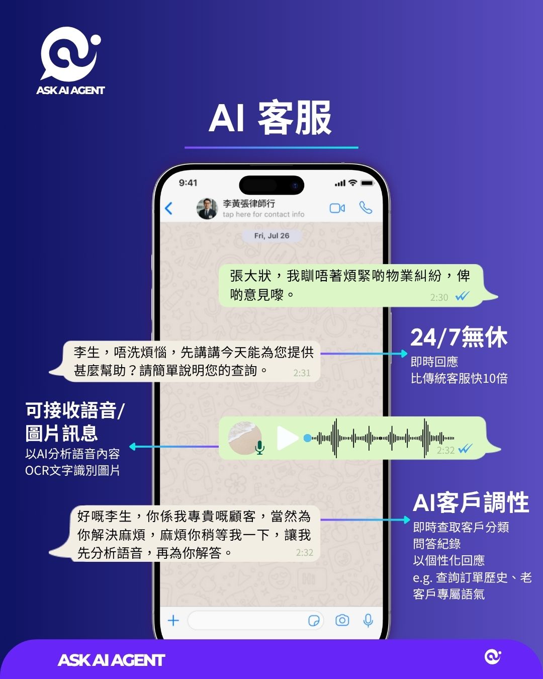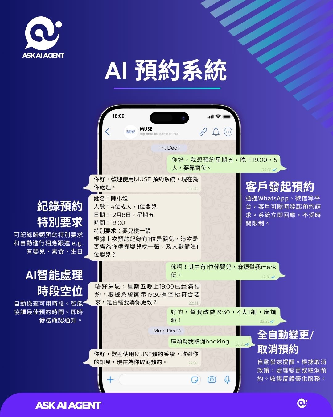 Ask AI Agent 是一套創新的AI員工解決方案,專為提升企業營銷效率與降低運營成本而設計,涵蓋各個範疇,包括AI客服、AI營銷、AI預約管理﹑AI開發與系統集成等等,適用於飲食、零售、金融、醫療等多個行業。