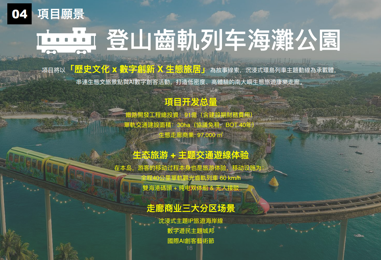 在香港南大屿位置兴建一个登山齒軌列車海灘公園,已经在2025年7月2日向香港发展局提交项目意见书,项目的鐵路開發工程總投資:91億港元,單軌交通建設面積:30ha,生態走廊商業: 97,000 ㎡。目前项目得到香港政府支持,并且目前已经有铁路开发商,我们在寻找投资者投资该项目。或者有酒店经营经验的合作伙伴