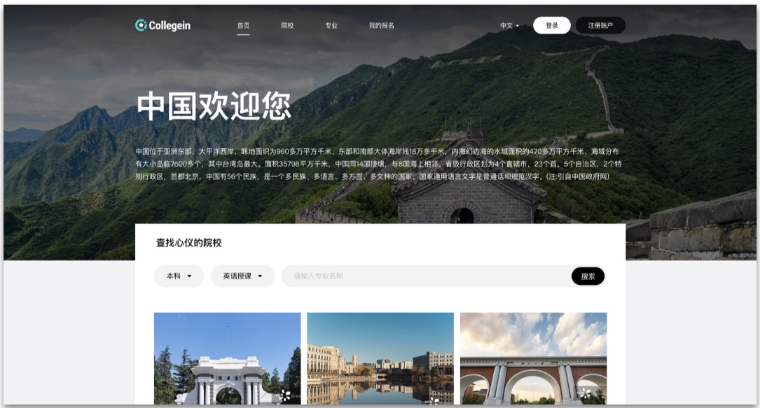 Collegein.com is an online education platform that helps global students to apply for Chinese Colleges, Internships and study tours. Beyond, it provides a post-graduation services for international students to do startup or internship in China. It’s officially launched in Dec, 2024. It now has over 100 agencies collaborating of recruiting students in over 20 countries and regions, also collegein.com provides an application system for over 100 colleges and other educational programs to help them manage the applicants and marketing in oversea countries.