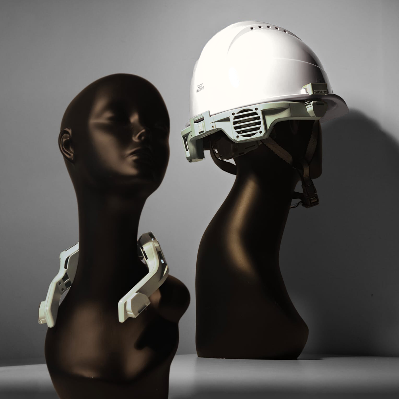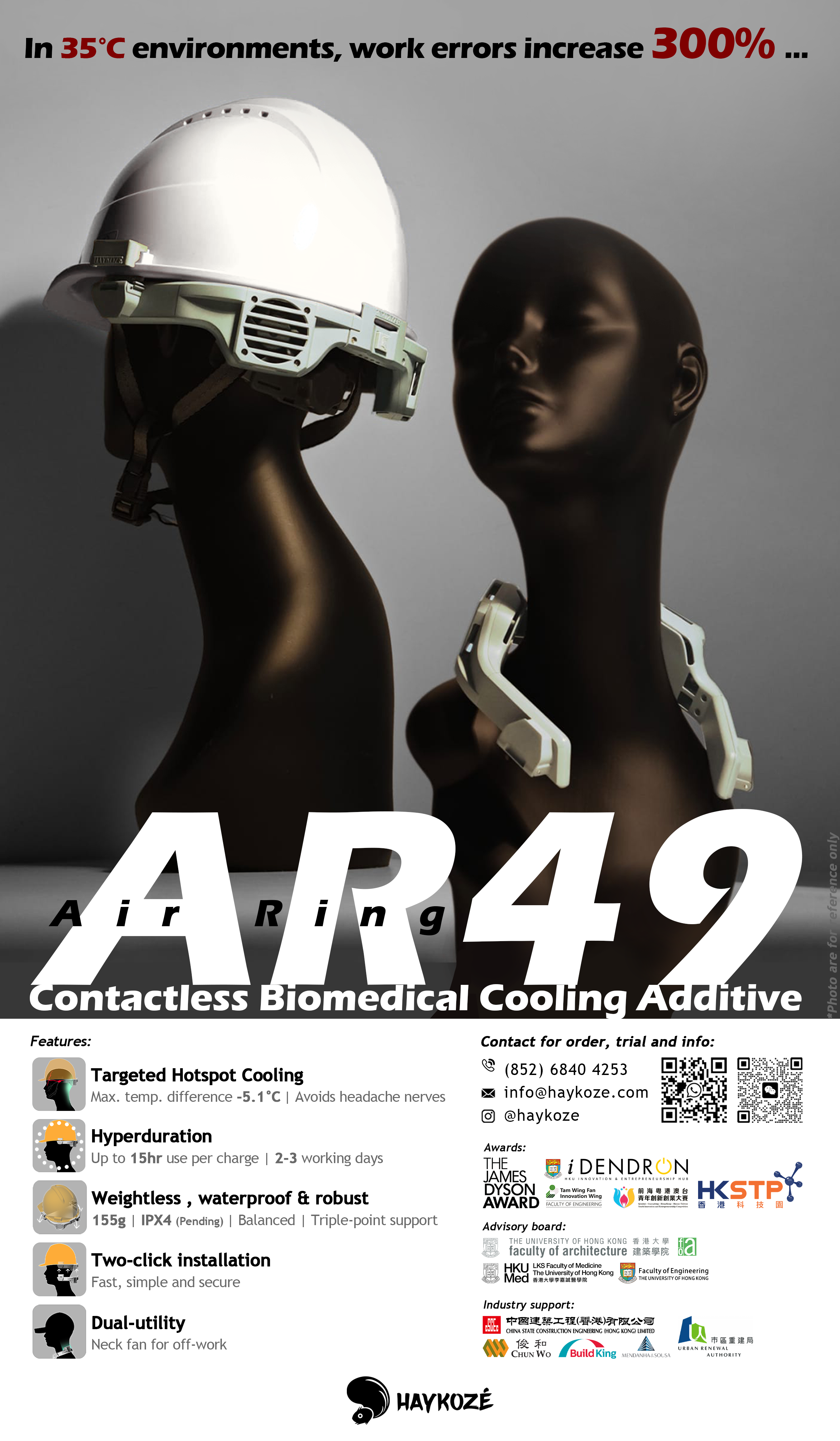 229m outdoor workers face 19,000 heat-related deaths and 22.85m occupational injuries each year, worsening with rising temperatures [ILO]. Air Ring 49(AR49) is a contactless, ergonomic biomedical cooling additive for outdoor workers to prevent heat-strokes, enjoy working conditions, and recover valuable hours of productivity. Created from 48 prototypes across 3 years, AR49 seamlessly integrates with any safety helmet with two-clicks, uniquely directing airflow to high-sweat areas behind the neck and ears. In collaboration with The University of Hong Kong's Faculty of Medicine, AR49 is proven to effectively lower skin-temperature by 5.1°C and core-temperature by 0.67°C, demonstrating a whole-body cooling effect while avoiding headaches. At 155 grams, AR49 offers up to 15hrs of cooling per charge, ensuring comfort and minimal distraction. Doubling as a neck fan when off-duty, AR49 is waterproof and impact-resistant, pioneering a new standard of safety. AR49 is supported by HKU’s Faculties of Medicine, Architecture and Engineering, trialed and adopted by government and major construction companies, and numerously accoladed e.g.2024 James Dyson Award.