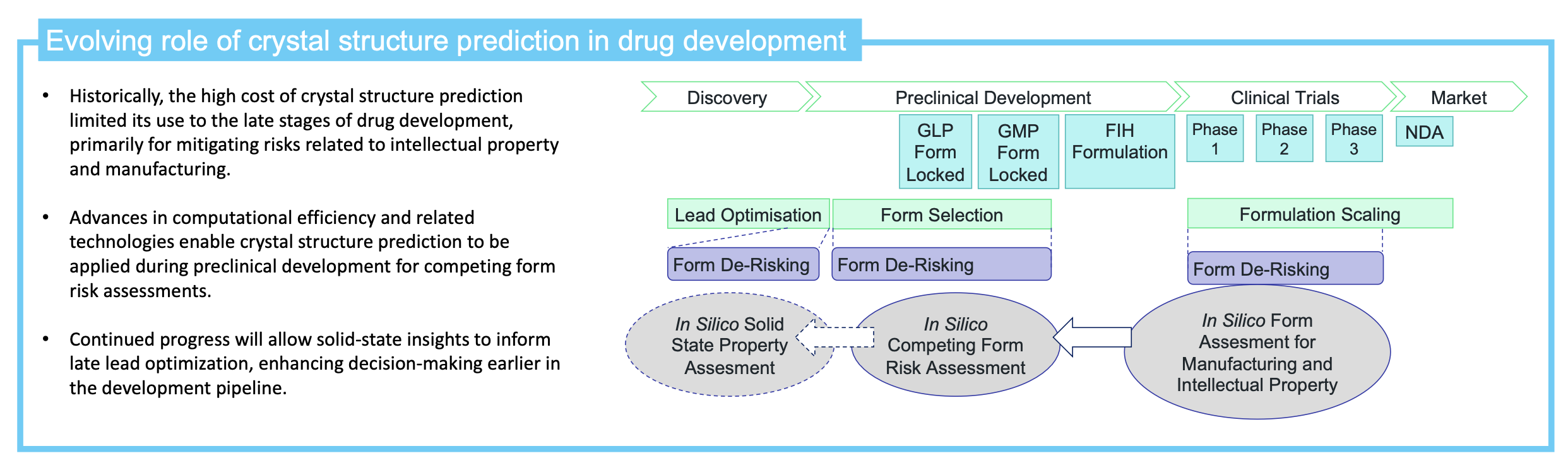 The platform only requires the input of the most basic 2D structure of a candidate molecule and from this it will generate a full landscape of predicted 3D crystal structures (polymorphs) for the molecule ranked by the most favourable ones in terms of stability (energy and density). This data is then used by the pharma/biotech customer to both validate and guide experimental lab work.