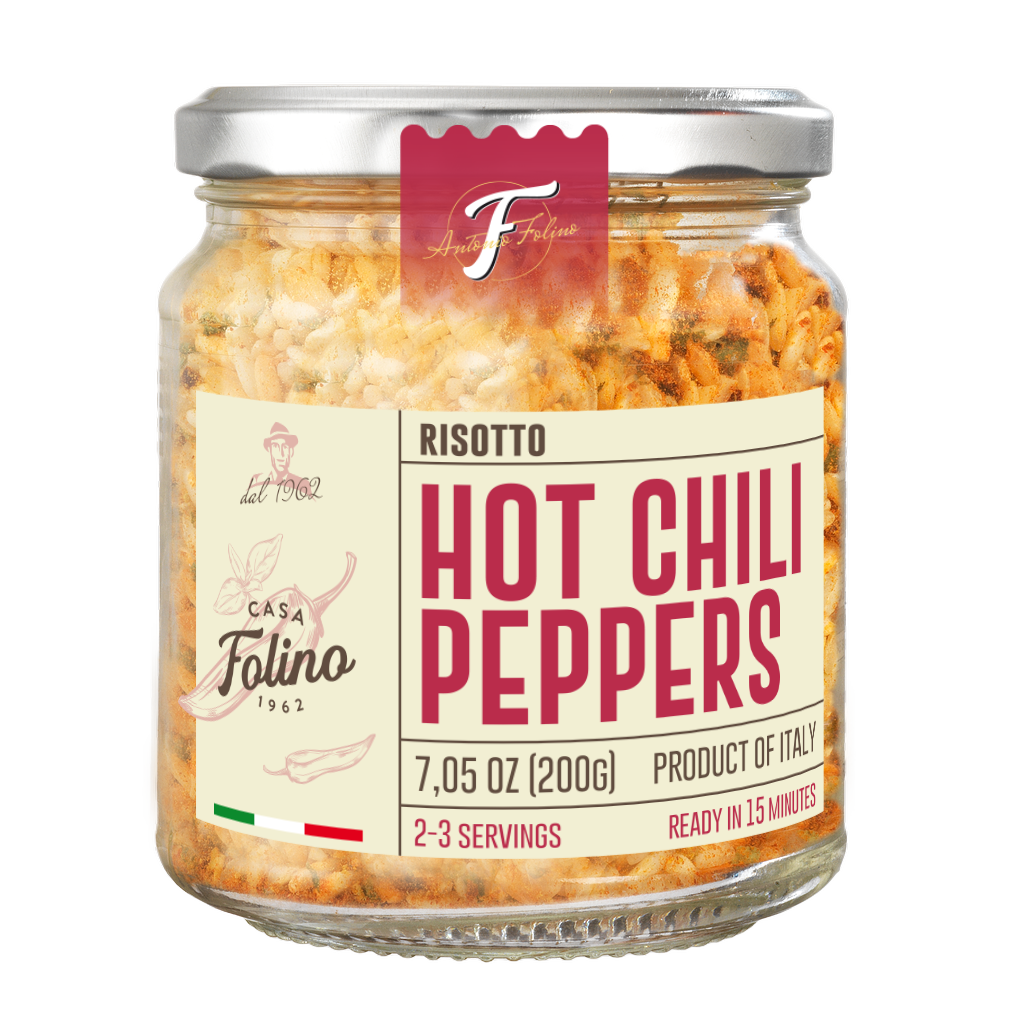 Ready-to-cook Carnaroli rice with tomato and chili for a spicy, Mediterranean-style risotto.