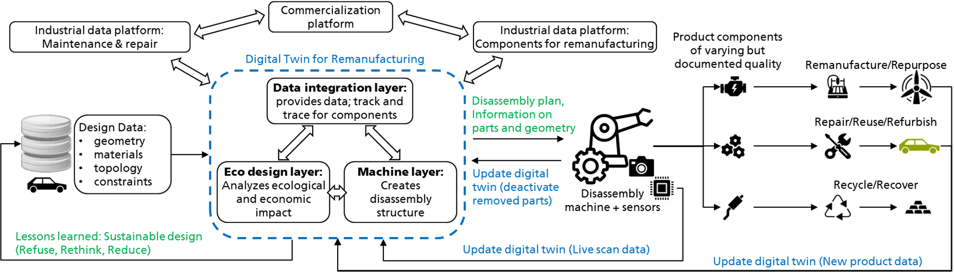 Our project “DigiTwin4Remanufacturing” is about collecting, transforming and providing data throughout the entire product life cycle of complex products with the purpose of enabling ecologically and economically sustainable end-of-life solutions. This is demonstrated by use-cases for automatic disassembly of a product as well as the subsequent remanufacturing into several new products.