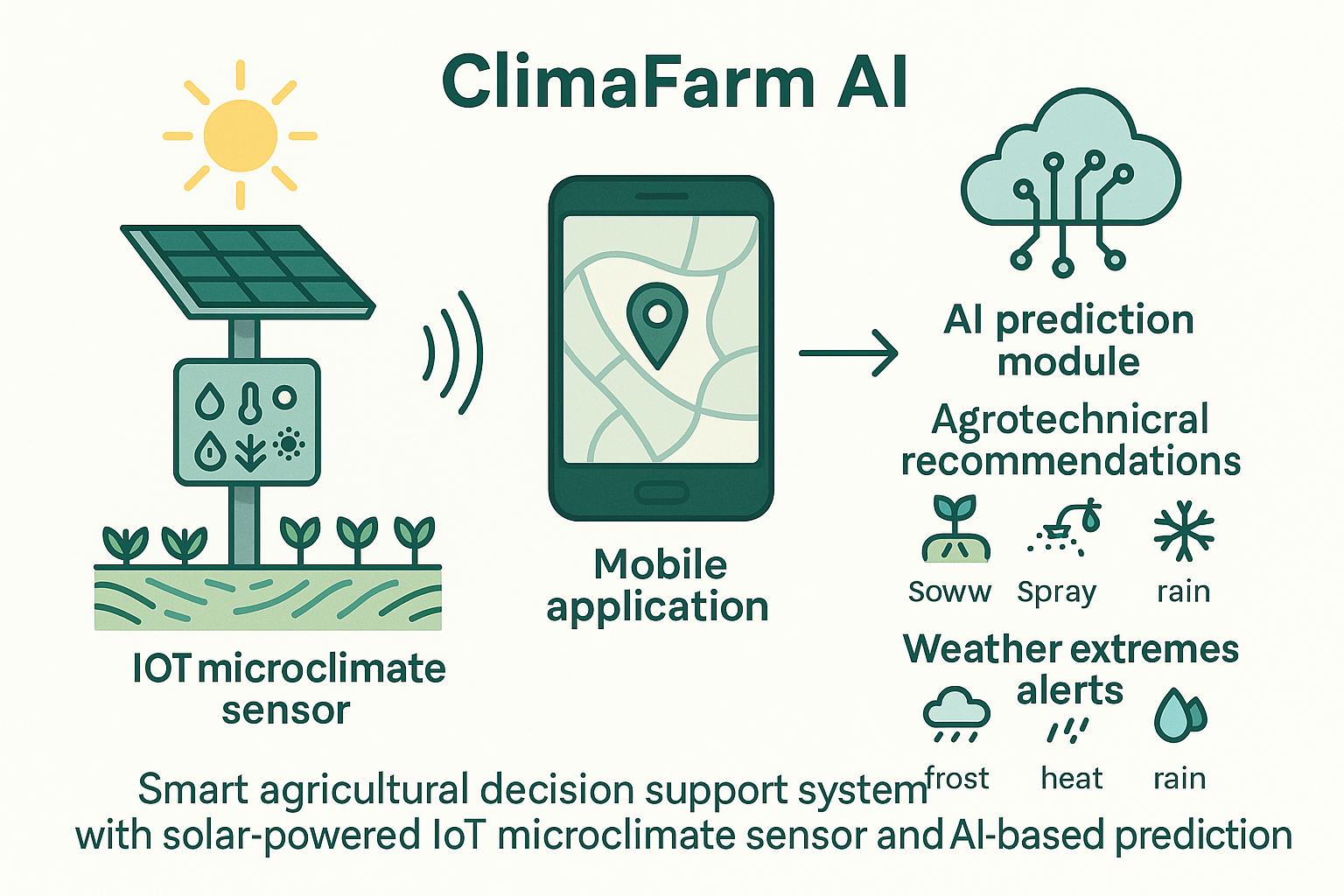 ClimaFarm AI is a Polish R&D-driven initiative developing a smart farming platform that combines solar-powered IoT microclimate sensors with AI-based prediction models to support agri-decision making. The solution provides real-time, field-level environmental monitoring (temperature, humidity, rainfall, solar radiation) and delivers localized, actionable recommendations to optimize key operations such as sowing, spraying, irrigation, and harvesting.