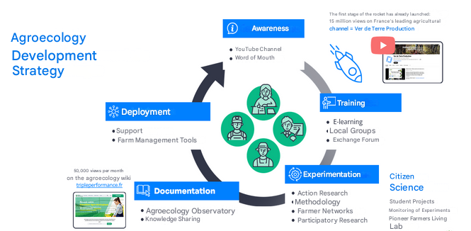 Ver de Terre Production is a french SME, created in order to promote and develop the living soil in a new way of communication and knowledges transfer. It gather farmers, researchers, actors of professional world and teachers under one global subject : soil is the heart of agricultural systems. The agriculture that we promote is based on the reduction of tillage and the temporal maximization of plant cover. Thanks to these guidelines, these plots see their carbon rate increase, which makes them real CO2 sinks. VDT is recognized in France to lead the open source diffusion of agroecology knowledge and pilot farmer portraits via a 15 millions views Youtube channel and online formations. Agriculture R&D is also done with on field quality measurement, knowledge platform animation (tripleperformance.fr) and a development of a pragmatic toolbox for farmers.