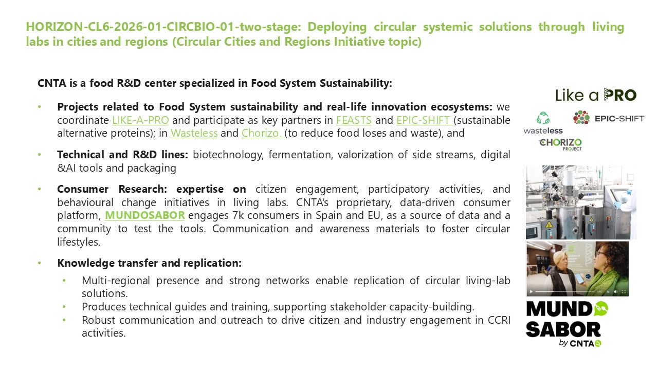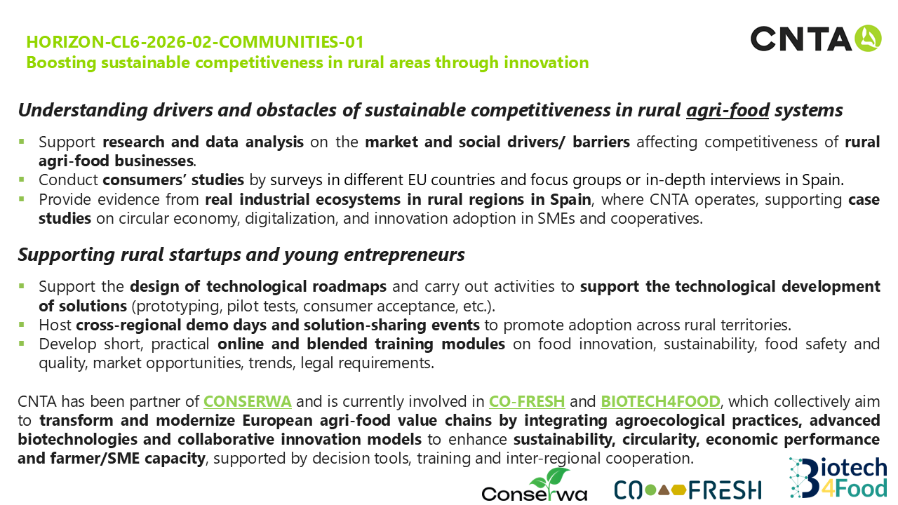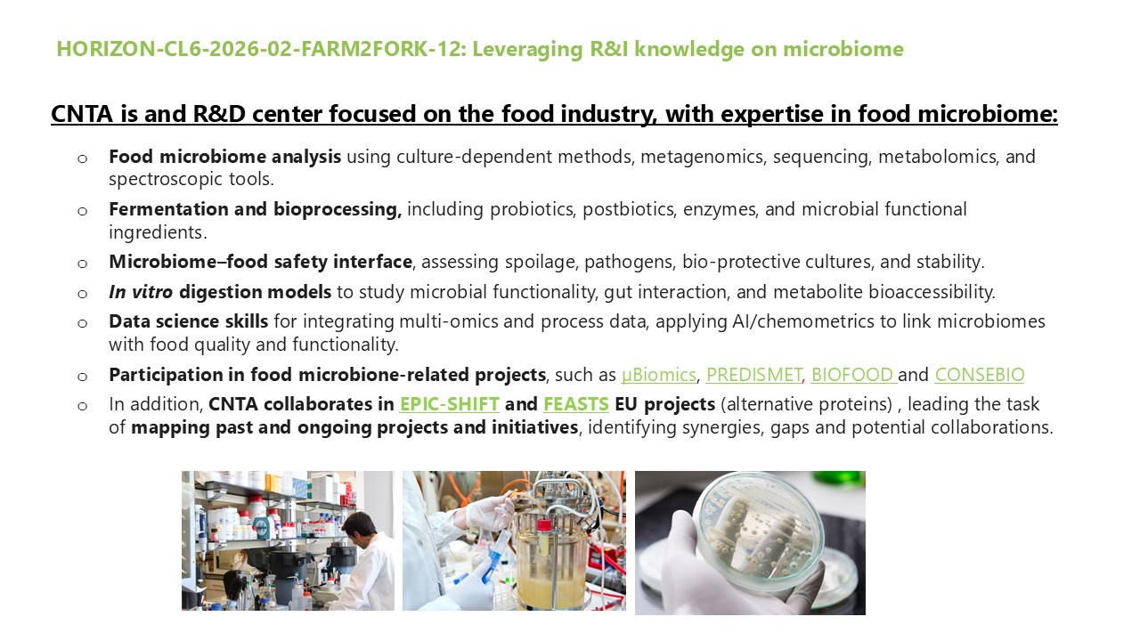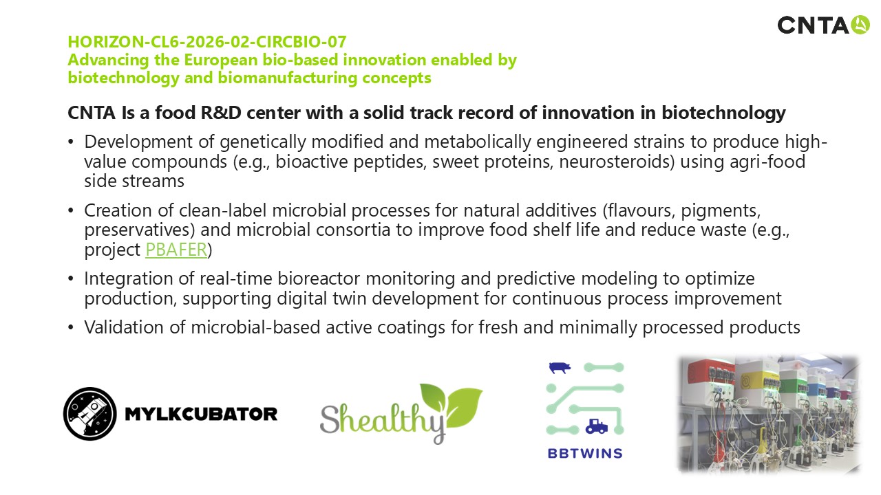 CNTA, the National Centre for Food Safety and Technology is a private non-profit business association. Since 1981, the aim of this technological research centre is to the development and innovation of the agrifood industry, offering technical support to improve their quality and competitiveness. CNTA acts as a key provider for knowledge, innovation and R&D&I services for over 900 industries (over 490 of which are associated members of CNTA).