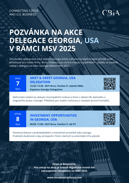 - Tato akce nabízí jedinečnou příležitost osobně se seznámit se zástupci amerického státu Georgia, popovídat si s nimi v přátelské atmosféře a zjistit více o možnostech spolupráce a podnikání na trhu USA. Koná se 7. října 2025 mezi 12:30 a 13:30 u expozice státu Georgia (stánek v rámci MSV 2025, pavilon P, stánek č. 098A). K dispozici budou zástupci místních municipalit (například Fulton County, nejlidnatějšího a ekonomicky nejaktivnějšího okresu ve státě Georgia), Oddělení ekonomického rozvoje státu Georgia, zástupci americké ambasády v Praze, české ambasády ve Washingtonu, D.C., firmy z Georgie úspěšně zasídlené v ČR a další hosté.