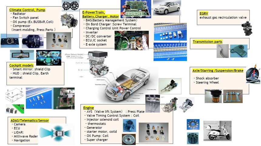 We provide ultra-precision plastic molded parts, board mounted terminals, insert molded components, touch panels, and optical mirror products from our manufacturing basses in Japan, Vietnam, Indonesia and China. We provide a wide variety of products to meet customer needs in a wide range of fields such as automobiles, Industrial machinery, home appliances, and optics.