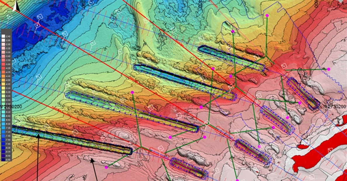 To increase the on-bottom stability of the cables & aide in the post-installation trenching & burial of cables through the shore-crossing, it is not uncommon for trenches to be pre-cut into the seabed. A previous AOE project example is shown below, varying from around 2 m to about 5 m below LAT. In this location, tidal levels vary by ~ 5 m. The marine environment in this location is characterised by periodic severe storms which result in breaking waves across this shore crossing, with the most onerous headings roughly orthogonal to the trenches. There exists a long-shore current of up to 0.5 m/s. The trenches varied between 2.2 m & 1.7 m deep & 5 m to 3 m wide at the base. These dimensions ignore the adjacent spoil berms & any backfilling of the trenches.
