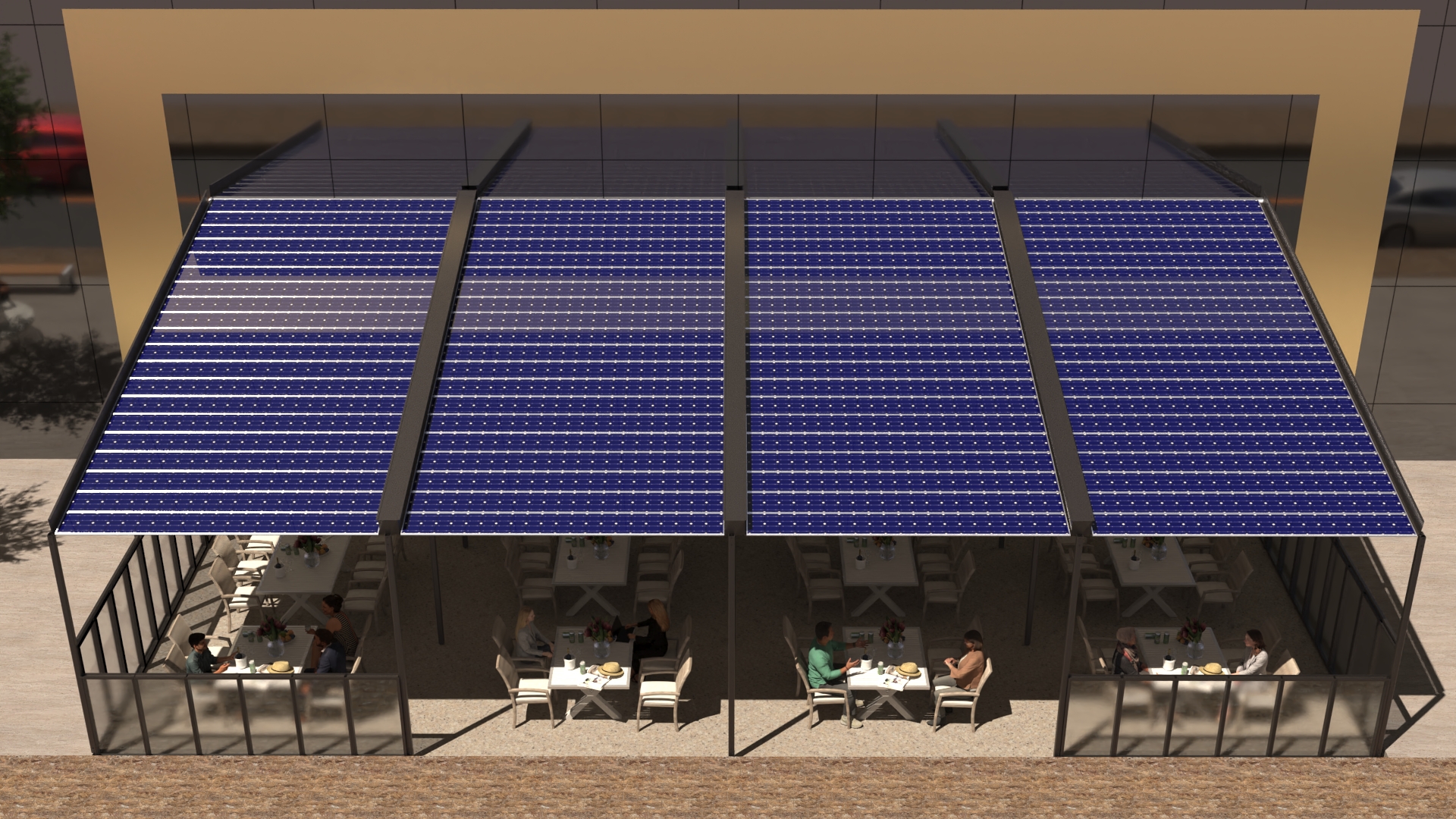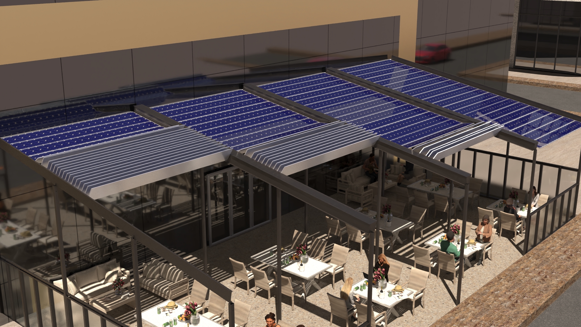 Traditional Sun Blocking System as known Pergola only protects people from the sun. On the other hand, by Accordion Solar Panels, it covers both of needs which are company's daily electricity needs and Protecting the your customers from the sun.