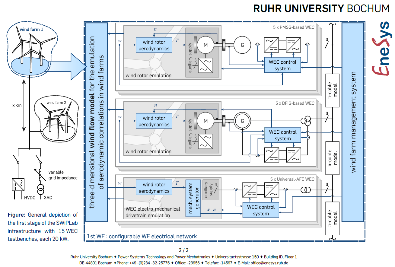 In addition to the SWiPLab infrastructure, the research cooperation with the Fraunhofer Institute for Wind Energy Systems (IWES) enables experimental validation on large- and real-scale com-ponent test benches. SWiPLab’s research capabilities are complemented by the expertise of the Institute for Power Systems Technology and Power Mechatronics (eneSys), who puts emphasis on a holistic approach, as well as the newly founded IWES branch office HoMAS.