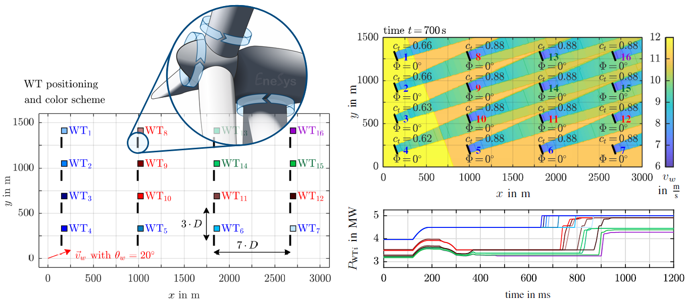 A high-resolution 3D wind flow model emulates the aerodynamic conditions (wakes and turbulence propagation, location-specific wind profiles) within WF in real-time