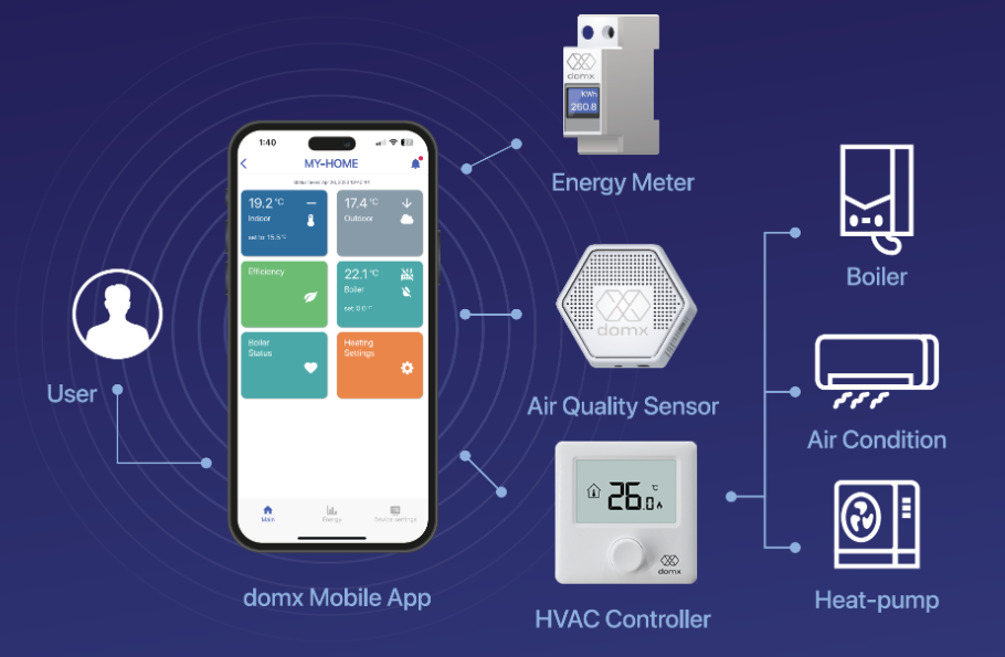 DOMX HVAC controller: Electrical heat-pumps employing the widely applicable Modbus data communication protocol, Natural Gas boilers employing the dominant European Opentherm standard, older heating units (oil, gas), managed through ON/OFF control