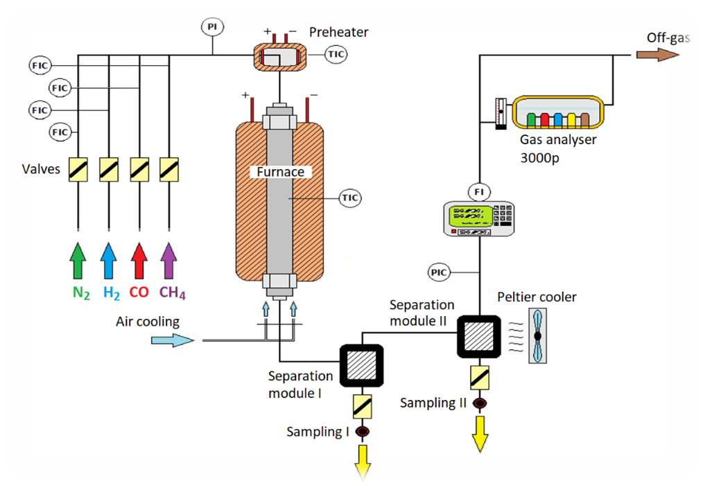 Tailored lab-scale synthesis reactor with a fixed catalytic bed with the aim of storing the atmospheric carbon in liquid products, utilisation of hydrogen in GtL stream, or determination of process parameters of catalysts of Co/Fe/Cu bases.