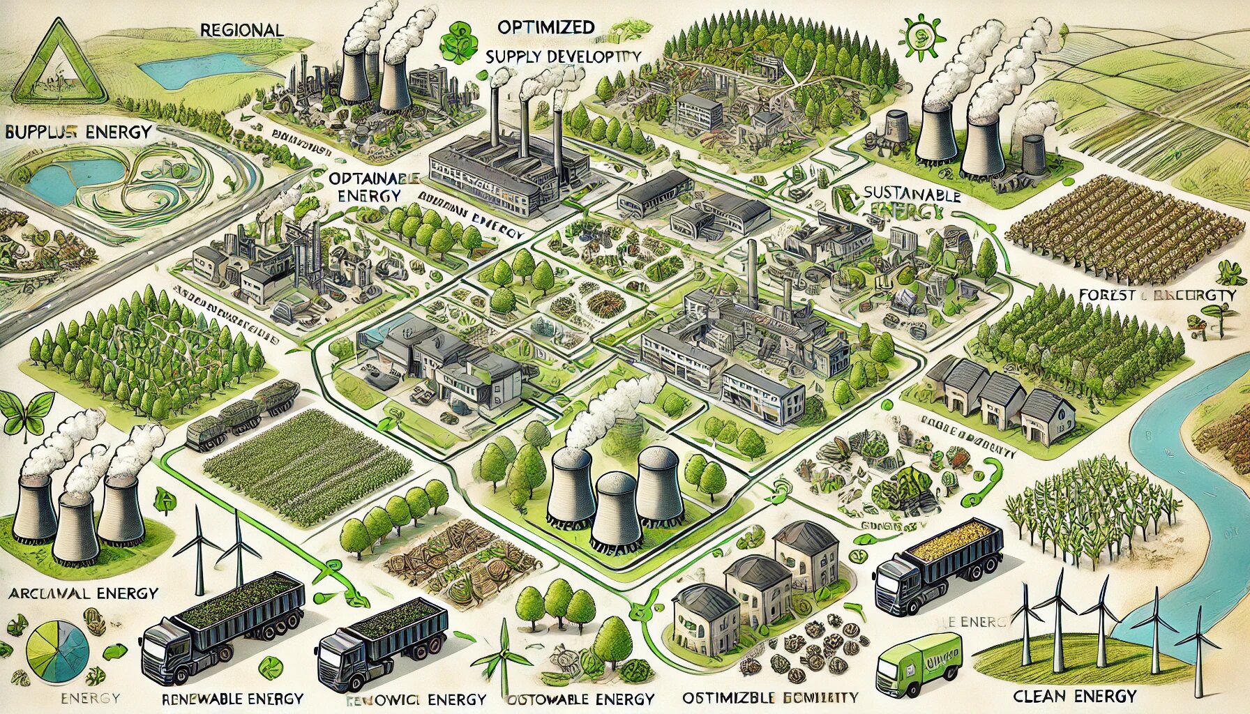 This project seeks to design and optimize a regional network of biomass-based energy production facilities that efficiently generate heat and electricity. By harnessing biomass resources, the project supports a renewable energy system with minimized emissions and reliance on fossil fuels. Our approach includes planning and constructing strategically located production and storage facilities that leverage diverse processing technologies suitable for various biomass feedstocks.