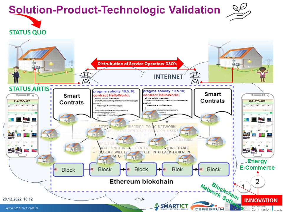 This project aims to find solutions that will enable producers and consumers of renewable solar energy to exchange energy with each other with the most innovative processes and products offered by information technologies. The project focused on the realisation of instant, subscription creation, energy purchase / sale and subscriber termination transactions with smart contracts (smart contrats) over the Blockchain network with the information technologies of two solar power generation points.