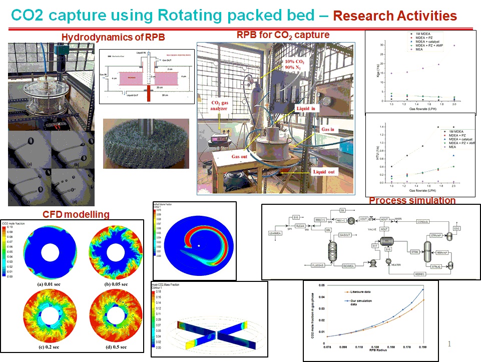 Our group has already a setup of the lab-scale rotating packed bed using a novel amines solution for carbon removal. This project was funded by DST, India. We have designed and fabricated a lab-scale system of rotating packed with a single rotor system to handle the maximum gas flow rate of 5 m3/hr and maximum rotational speed of 1500 rpm. Hydrodynamics, liquid visualisation and carbon removal efficiency are conducted using a lab-scale rotating packed bed system. Furthermore, CFD modelling of hydrodynamics, mass transfer and reactive mass transfer in the rotating packed bed is conducted using both the volume of fluid (VOF) multiphase modelling and Eulerian porous media approaches. The hydrodynamics characteristics in terms of liquid flow patterns and holdup in the rotating packed bed are studied using the volume of fluid (VOF) method . In the case of reactive mass transfer, CO2 capture efficiency is obtained using Eulerian multiphase porous media approach. The model results are validated with the experimental data for different liquid loads and rotating speeds. A process simulation of the post-combustion CO2 capture system using RPB is performed using Aspen plus to study techno-economic feasibility analysis. The simulation of a rotating packed bed is studied using empirical correlations available in the literature for the liquid holdup, mass transfer and pressure drop via user-defined subroutine. The model validation is validated with the literature. Finally, to compare performance, the economic analysis between the convectional post-combustion CO2 capture system and the intensified system is studied.
