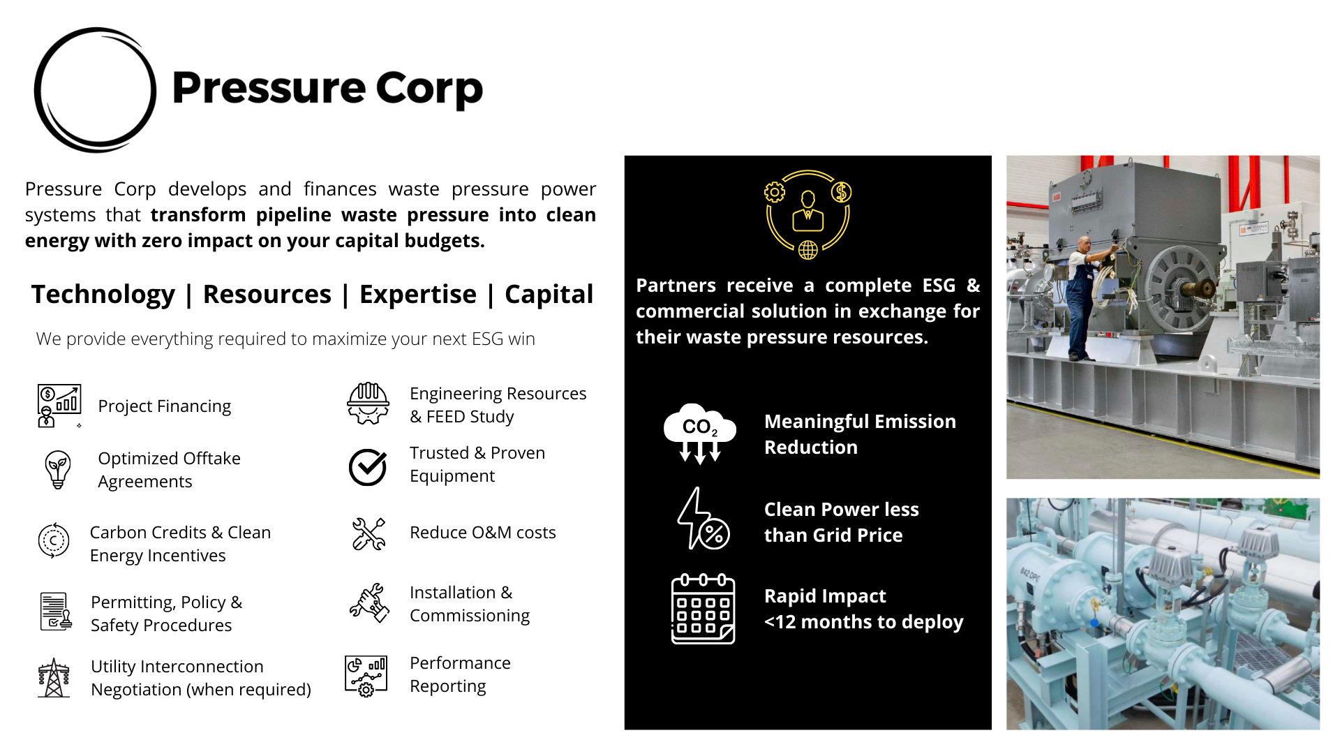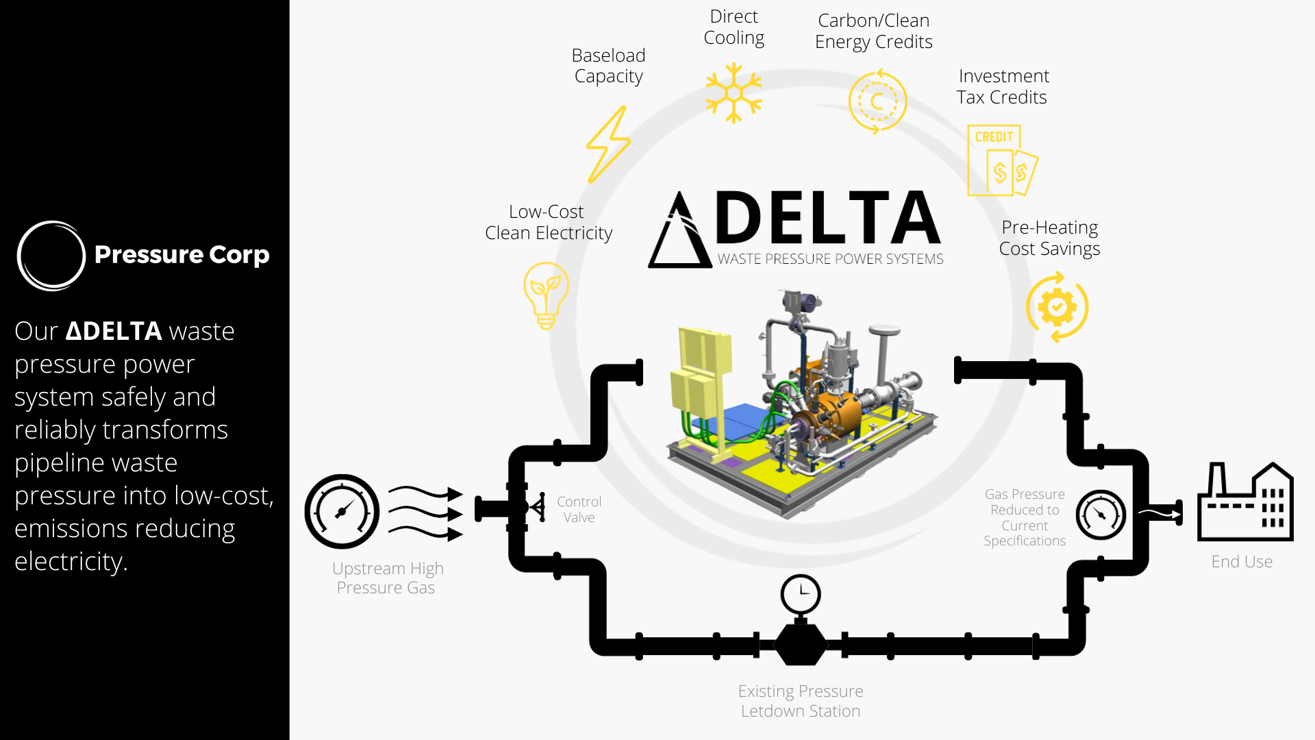 Pressure Corp is seeking a project partner to deploy our DELTA waste pressure power system that converts ΔP found at JT valves or pressure letdown stations into clean energy. Ideal partners are oil and gas pipeline operators, industrial manufacturers, utilities or local distribution companies.