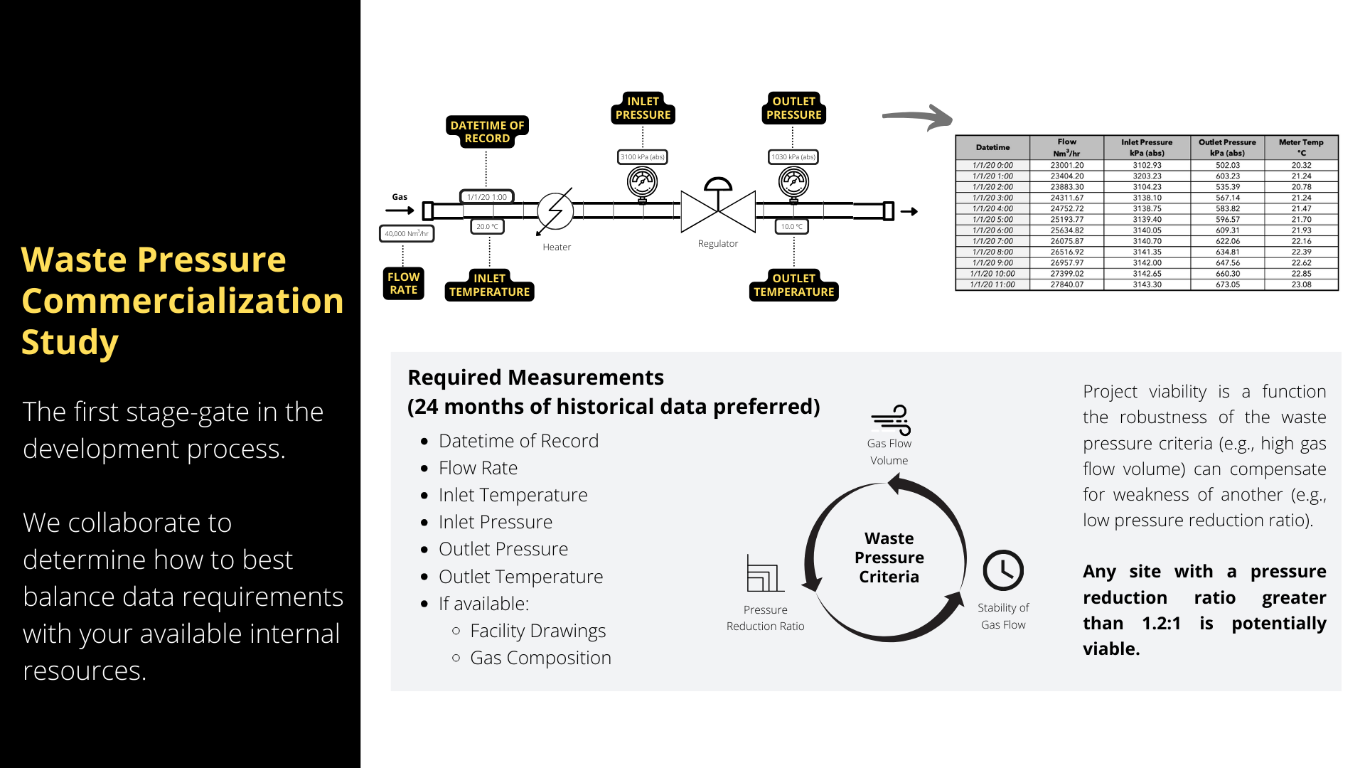 Pressure Corp is offering companies to take advantage of our Waste Pressure Algorithm that quantifies the clean energy potential of any location where a pressure drop is found. We require up to two-years of historical gas flow data that includes easily found information such as volume and pressure drop to complete our study.