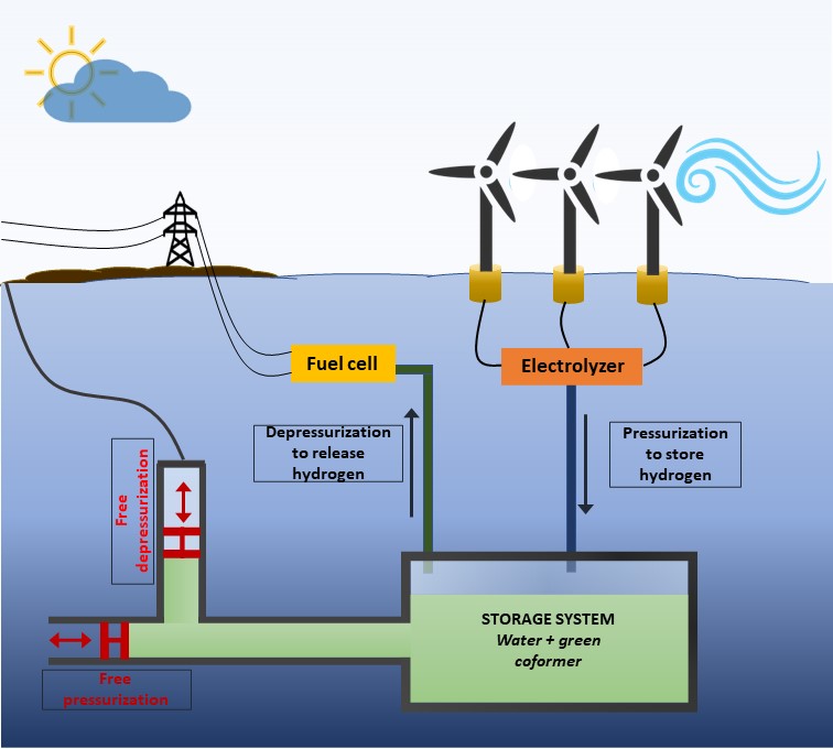 The objective of this project is to develop low-cost, high-safety media for the storage of hydrogen, which also have minimal technologic and maintenance requirements. Target storage media will be suitable for offshore wind fields, where hydrogen will be produced by wind-powered sea water electrolysis during low-demand hours. The storage media that the present project will develop are clathrate hydrates of hydrogen. Clathrate hydrates are formed under conditions of high pressures and low temperatures, which are available on the sea floor at no cost. Furthermore, the main storage medium, i.e., water, is plentiful at sea. The scientific aims are to overcome critical points of hydrogen storage in clathrates, namely (i) slow capture kinetics, and (ii) low gravimetric content. As for point (i), we will start from our patented processes and molecules for improving the kinetics of the process. The increase of the gravimetric content (point (ii)) will instead be addressed with the design and test of stabilizers of the hydrate cages, through a combination of theoretical and experimental approaches. As a technological aim, a proof-of-concept design of a seafloor device for hydrate formation will be developed. This project fulfils the technical scope of Call TRI3.2: Hydrogen and renewable fuels, particularly as relates to the production of green hydrogen to be stored into hydrates, and the deployment of the proposed storage media in large scale storage settings.
