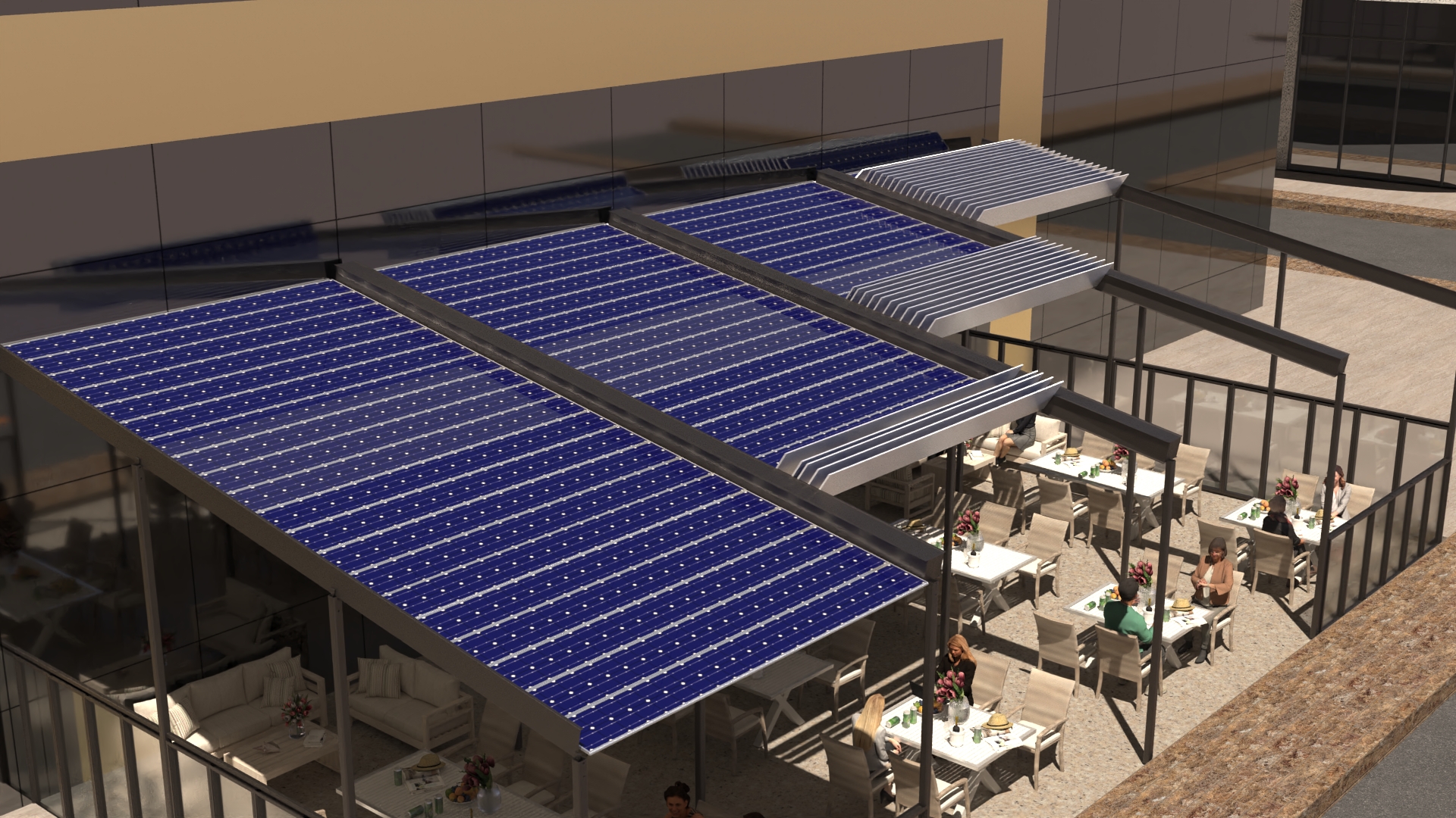 Mostly Coffeshop where people will need sun blocking and the system will support coffeeshops electricity needs.