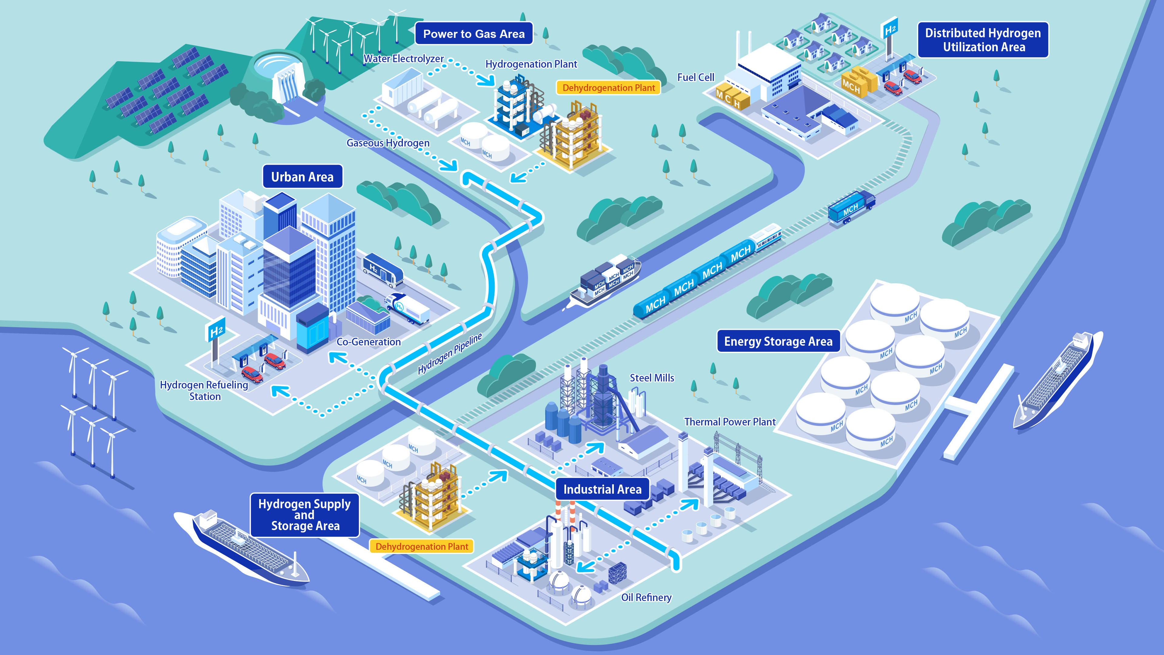 Chiyoda offer technology and enginnering service to develop hydrogen supply chain to transport, storage hydrogen by LOHC technology.