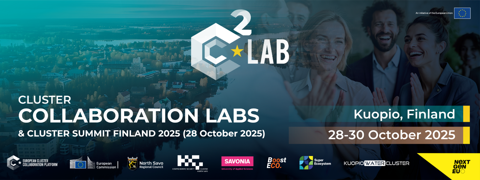 The European Cluster Collaboration Platform, in collaboration with Kuopio Water Cluster, Comprehensive Security Cluster North Savo, SuperEcosystem, BoostECO, Savonia University of Applied Sciences, and North Savo Regional Council, invites you to join the Cluster Summit Finland 2025 on 28 October and the next edition of the Cluster Collaboration Labs (C2Lab) on 29-30 October 2025. The events will take place in Kuopio, Finland, and are a great opportunity to meet, discuss cluster policies, and develop new projects.