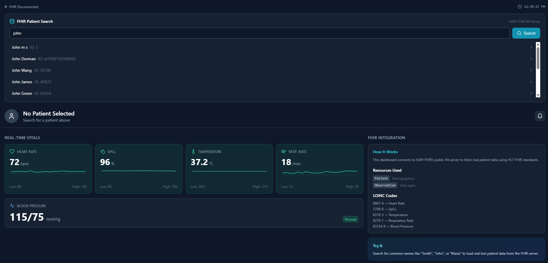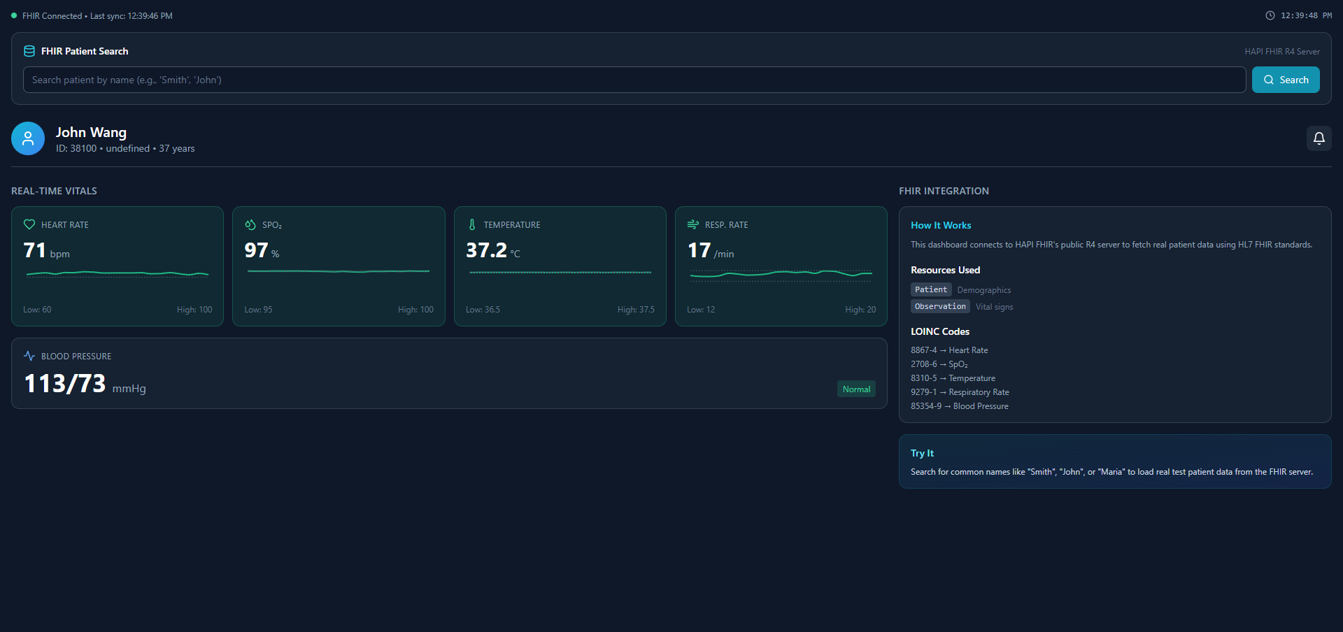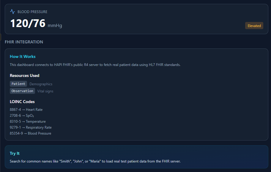 We have developed a fully functional FHIR R4-compliant patient monitoring dashboard that demonstrates real-time vital signs tracking, clinical observations management, and seamless integration capabilities with existing Electronic Health Record (EHR) systems.
