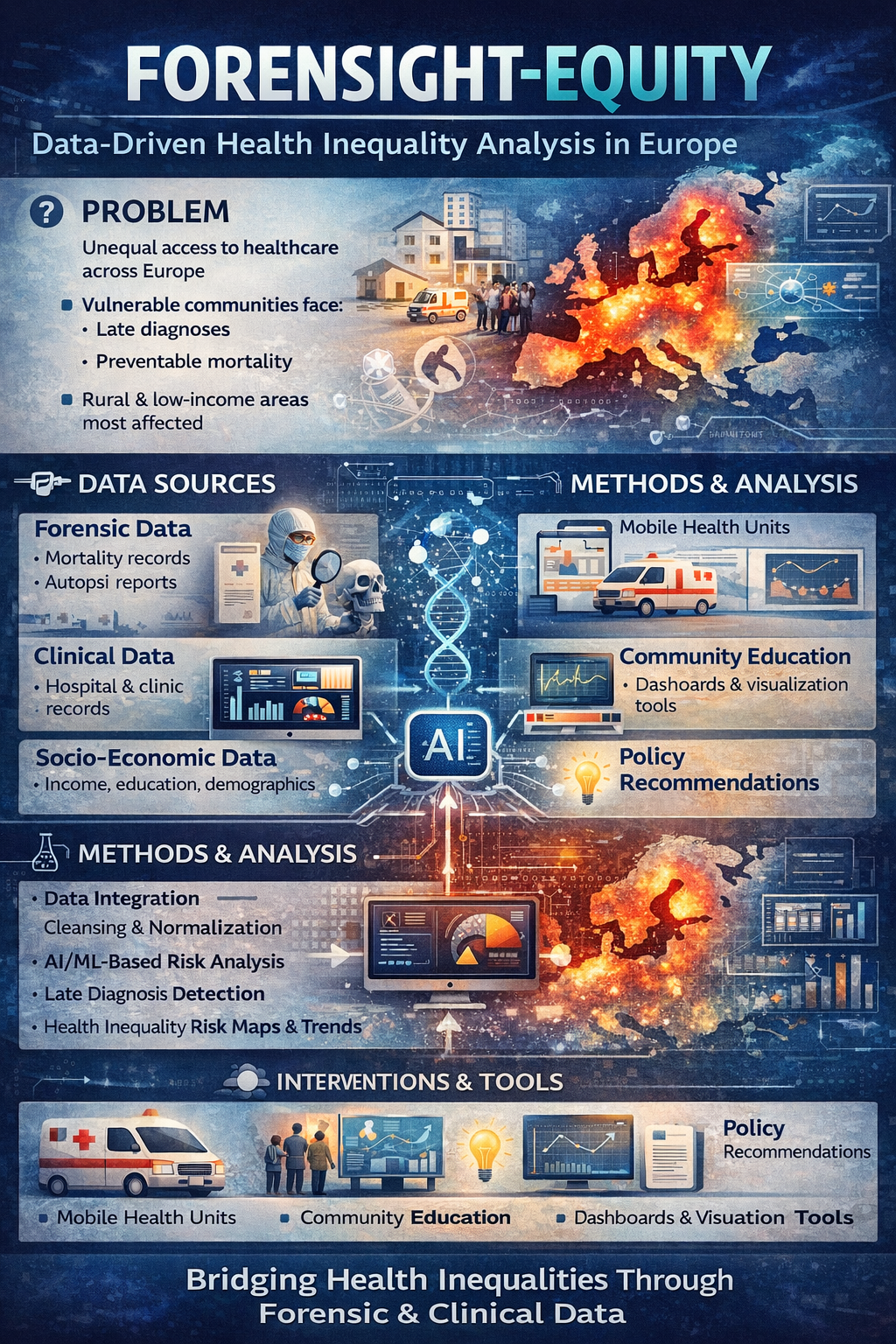 FORENSIGHT-EQUITY is a Horizon Europe project aiming to address health inequalities in vulnerable European communities. The project integrates forensic data (mortality records, autopsy reports) with clinical and socio-economic datasets to identify hidden patterns of late-diagnosis cases and systemic gaps in healthcare access.