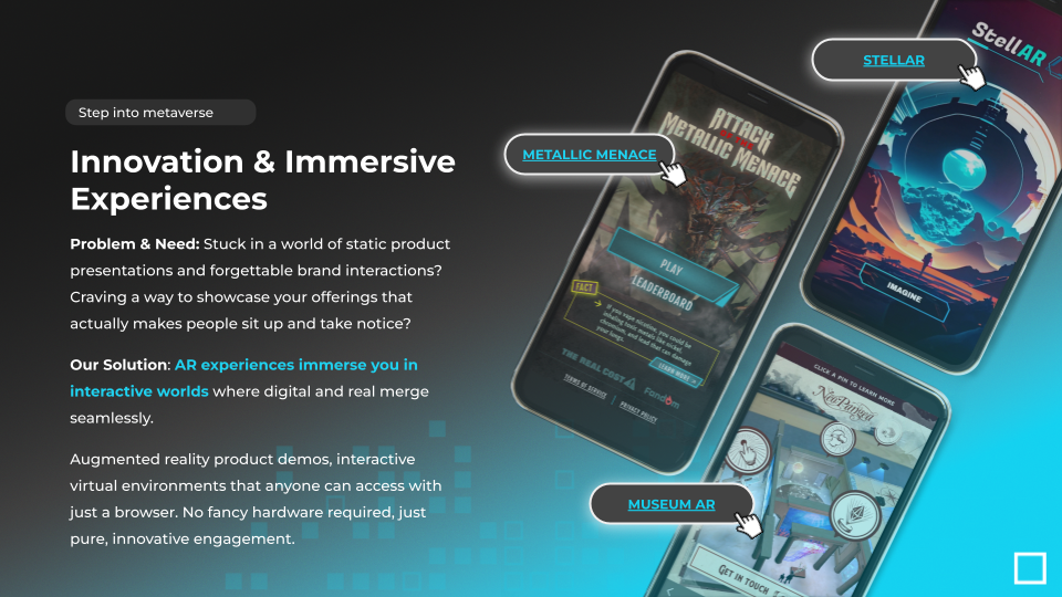 We develop interactive Augmented Reality (AR) and Virtual Reality (VR) experiences accessible directly from the web, without requiring downloads or special devices. Our technology enables brands to create microverses, 3D product showcases, and virtual spaces that are instantly available to their audience.