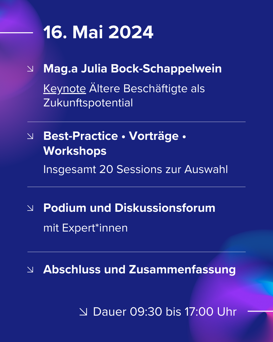 16. Mai von 09:30-17:00 Uhr. Beginn und Keynote 4, insgesamt 20 Workshops, Vorträge und Best-Practice-Vorstellungen zum Auswählen, Diskussionsforum, Zusammenfassung und Abschluss