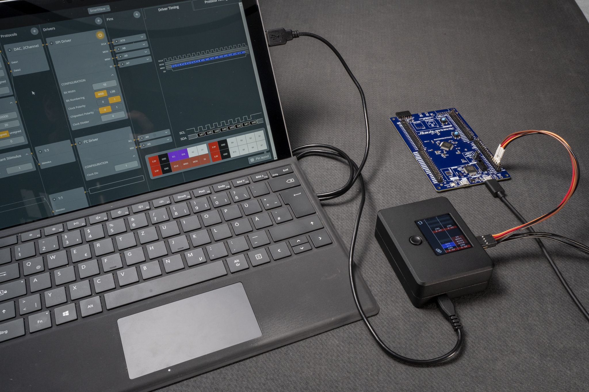 SmartWave enables you to instantly communicate with multitude of devices like ADC, DAC, Sensors and many more via industry standard interfaces such as SPI or I2C and flexible GPIOs.