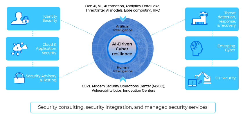 Our cybersecurity services deliver comprehensive protection powered by cutting-edge AI across your entire business lifecycle. We offer strategic consulting to help you define your security posture, provide intelligent solution integration to implement robust defenses, and deliver continuous AI-powered managed security services through our global network. This ensures unparalleled protection, empowering you to navigate the evolving threat landscape with unwavering confidence.