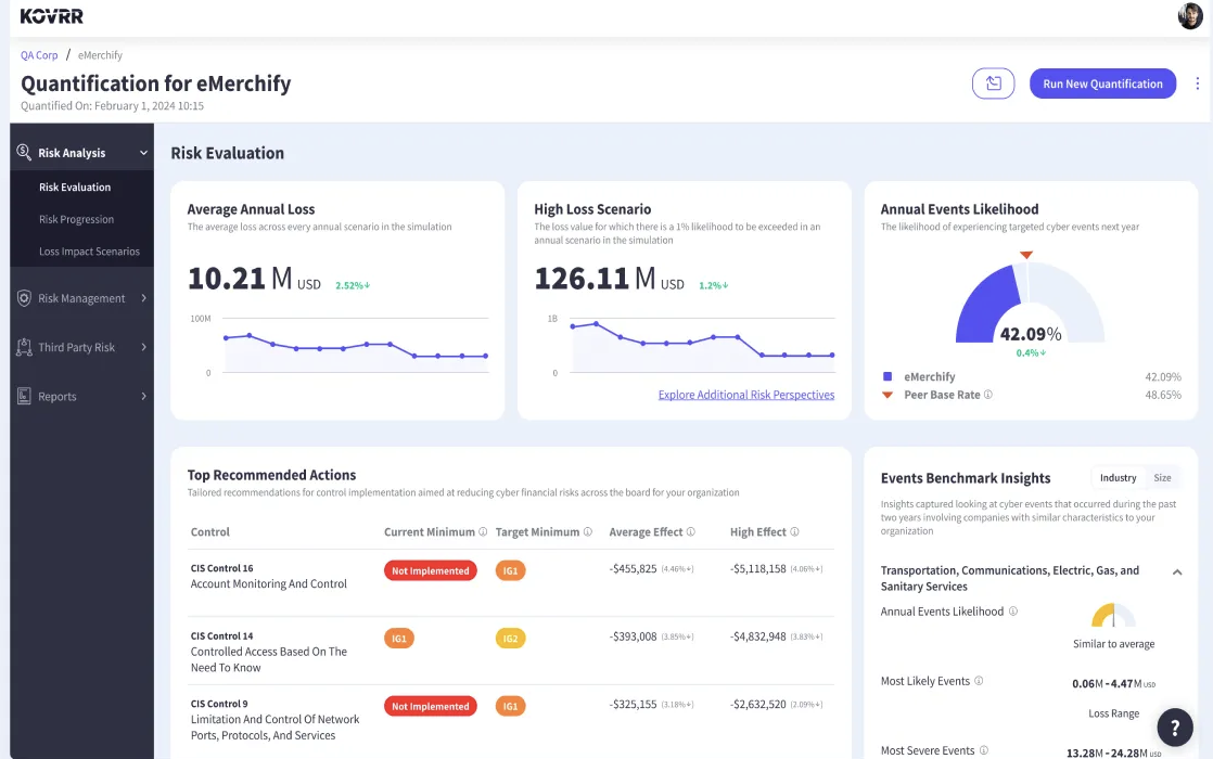 Spearheading the CRQ revolution and Shift Up strategy, delivering on-demand financially quantified cyber insights with unmatched granularity. Kovrr's cyber risk quantification platform empowers enterprise decision-makers to manage cyber exposure more effectively by providing an in-depth risk analysis that drives actionable, financially justified decisions that align with broader business goals. Regardless of an organization's current framework, model, or risk register, Kovrr leverages the data and elevates the relative level of insight. Our enterprise-ready solution offers security teams a more granular, on-demand risk assessment that's communicable at the highest organizational levels. Employing advanced cyber risk models and technologies trusted by cyber insurers and reinsurers worldwide, the platform shifts complex cybersecurity data into understandable financially-driven insights. Harnessing our exclusive access to large-scale insurance data and offerings, Kovrr's models are continuously validated based on data from millions of global companies. Kovrr's data-driven approach is built from the ground up, facilitating objective, frictionless, and everevolving financial cyber risk quantifications that offer key stakeholders, including CISOs, CROs, board members, and investors, the necessary answers to circumvent significant financial losses and enhance resiliency. Kovrr's powerful CRQ models lay the framework for business leaders to balance enterprise risk appetite, transfer, and mitigation activities. Shifting strategic cybersecurity discussions up to the top levels of an organization ensures optimal ROI on cyber investments while simultaneously reducing business vulnerabilities to cyber attacks and third-party service provider failures.