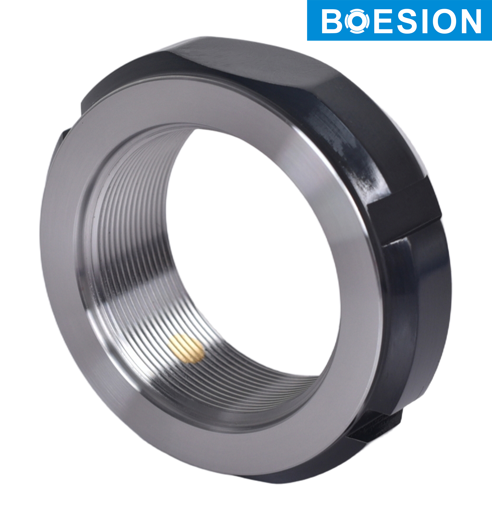 Precision lock nut with locking pins. KMT precision lock nuts are intended for applications where high precision, simple assembly and reliable locking are required. The three equally-spaced locking pins enable these lock nuts to be accurately positioned at right angles to the shaft. However, they can also be adjusted to compensate for slight angular deviations of adjacent components. Maximum axial run-out between the locating face and thread (up to size 40): 0.005 mm