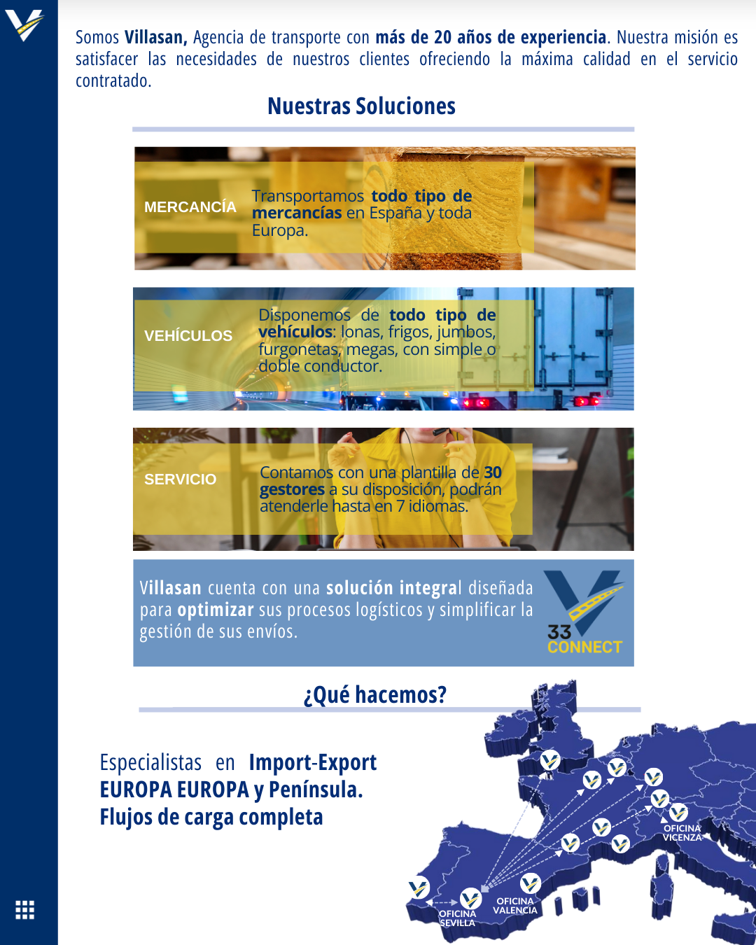 En GRUPO VILLASAN ofrecemos a nuestros clientes de manera gratuita la plataforma digital Villasan 33Connect. Esta herramienta propia nos permite optimizar rutas, mejorar la eficiencia operativa y ofrecer a nuestros clientes visibilidad total de sus envíos desde cualquier dispositivo.