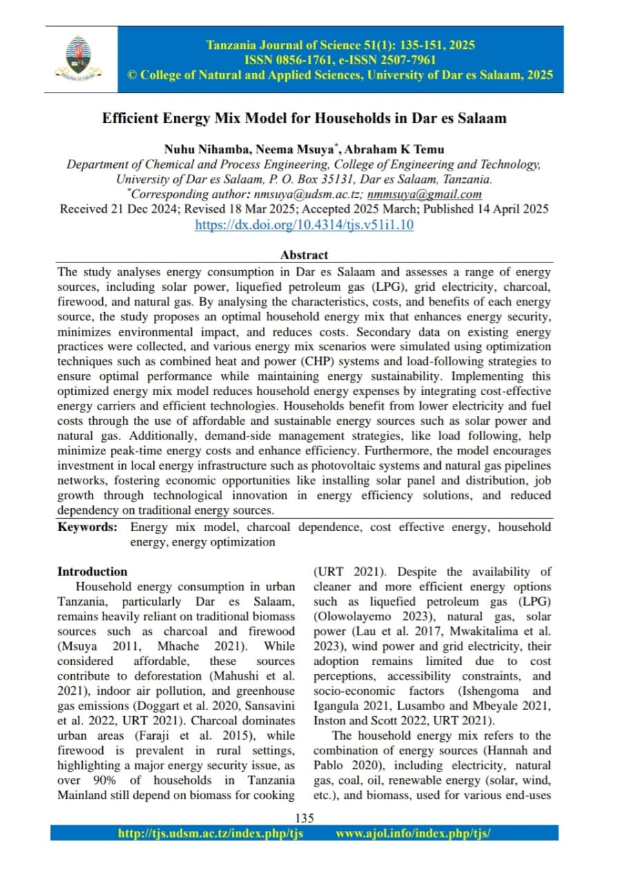 I am the originator of a peer reviewed household energy mix optimisation model, developed using Dar es Salaam as a case study, which demonstrates significant reductions in household energy costs through data-driven integration of clean energy sources such as solar PV, grid electricity, gas, and efficient appliances.