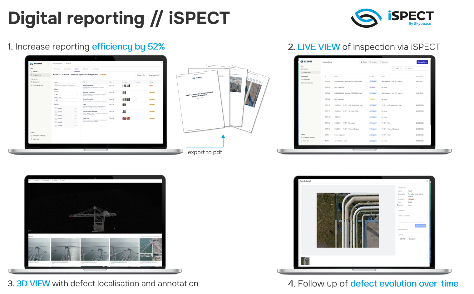 Skyebase is a technology-driven inspection partner for on- offshore and marine industries, specializing in drone and robotic data acquisition. Using advanced sensors and our proprietary iSPECT platform, we deliver high-quality insights that support inspection efficiency, predictive maintenance, operational reliability, and regulatory compliance. Our solutions replace traditional high-risk inspections with safer, faster, and more cost-efficient methods, enabling asset owners to minimize downtime, extend asset lifetime, and make smarter, data-driven decisions.