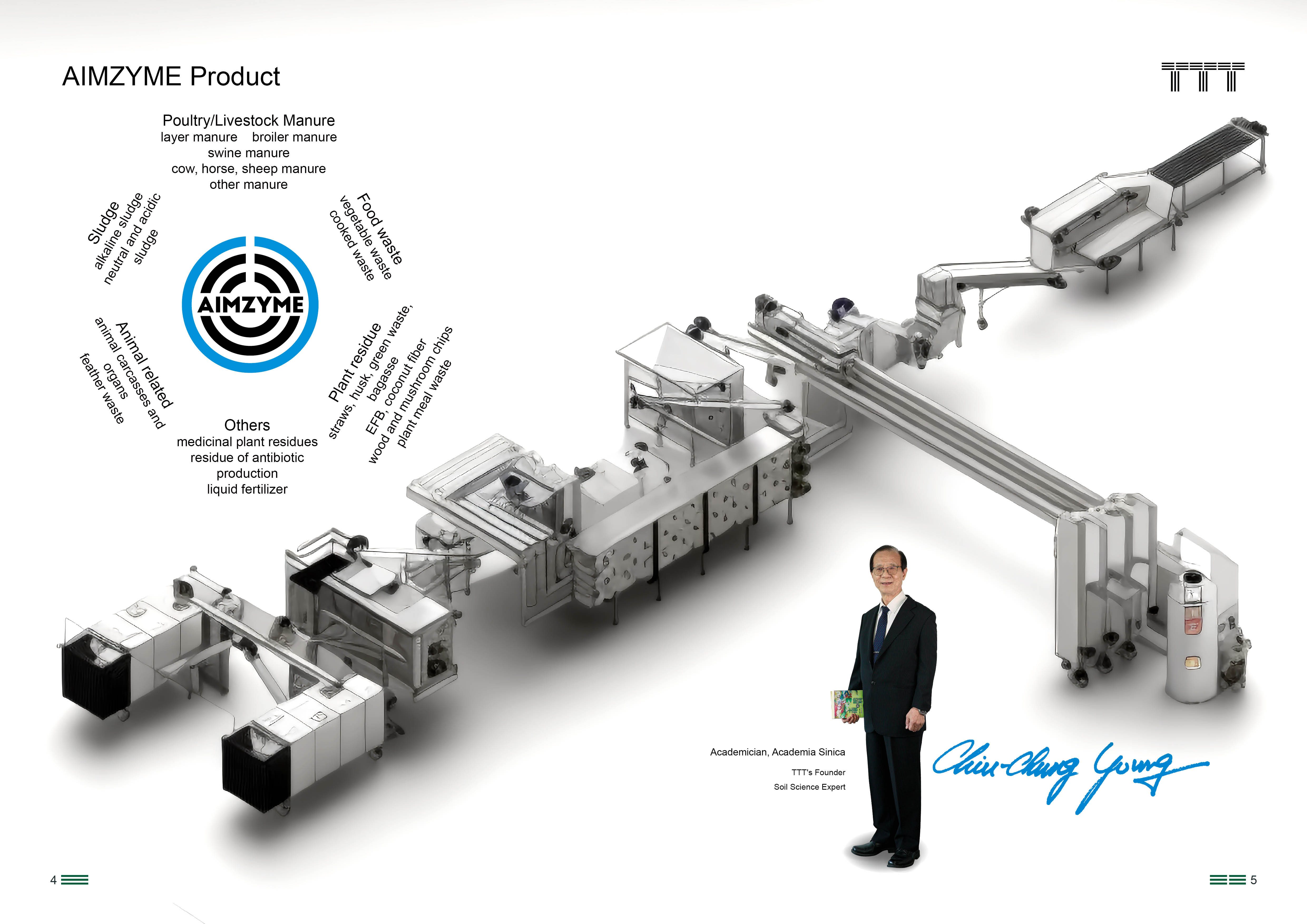TETANTI's core-TTT® Technology, a revolutionary “enzyme-based” organic waste treatment process, was developed by Academician Dr. Chiu-Chung Young, which simplifies the traditional microbial composting method that is adversely associated with long duration and multiple environmental pollutions. TTT® Technology utilizes enzymes (AIMZYME®) and the combination of machinery (TTT® inside certified), the organic wastes are stabilized and maturized into stable and high-quality organic fertilizers within 3 hours. In addition, the organic fertilizer is mostly free of pathogens, insect eggs and grass seeds after high temperature sterilization, and thus is safe and eco-friendly. TTT® Technology is effective with reasonable cost, the process avoids the generation of bad smell and secondary waste, accomplish carbon emission reduction. It is a comprehensive solution for organic waste recycling and environmental protection with space- and time-efficiency.